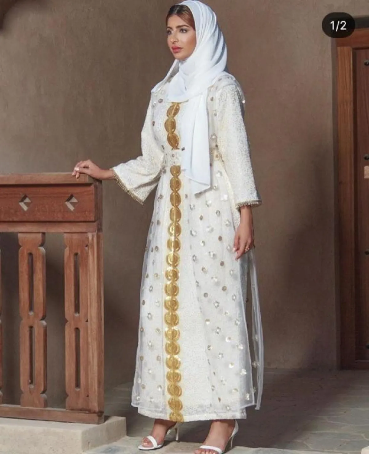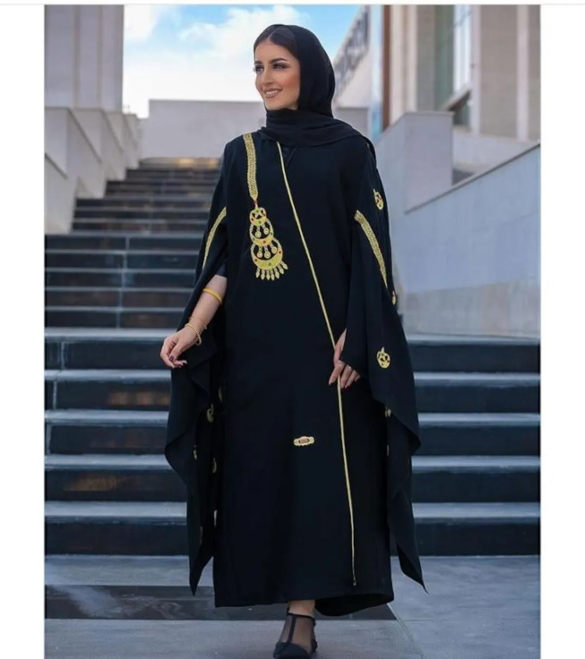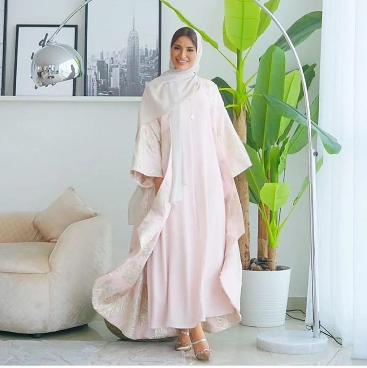 إذا كنتِ لا تميلين كثيرًا لاعتماد القفاطين بسبب تطريزاتها الكثيرة، فلِمَ لا تختارينها كالعباية من البلوجر روان، مع بعض التطريزات بالخيوط الذهبية البسيطة، مع حزام الخصر، نسقت معها حجابًا وصندلًا باللون الأبيض.