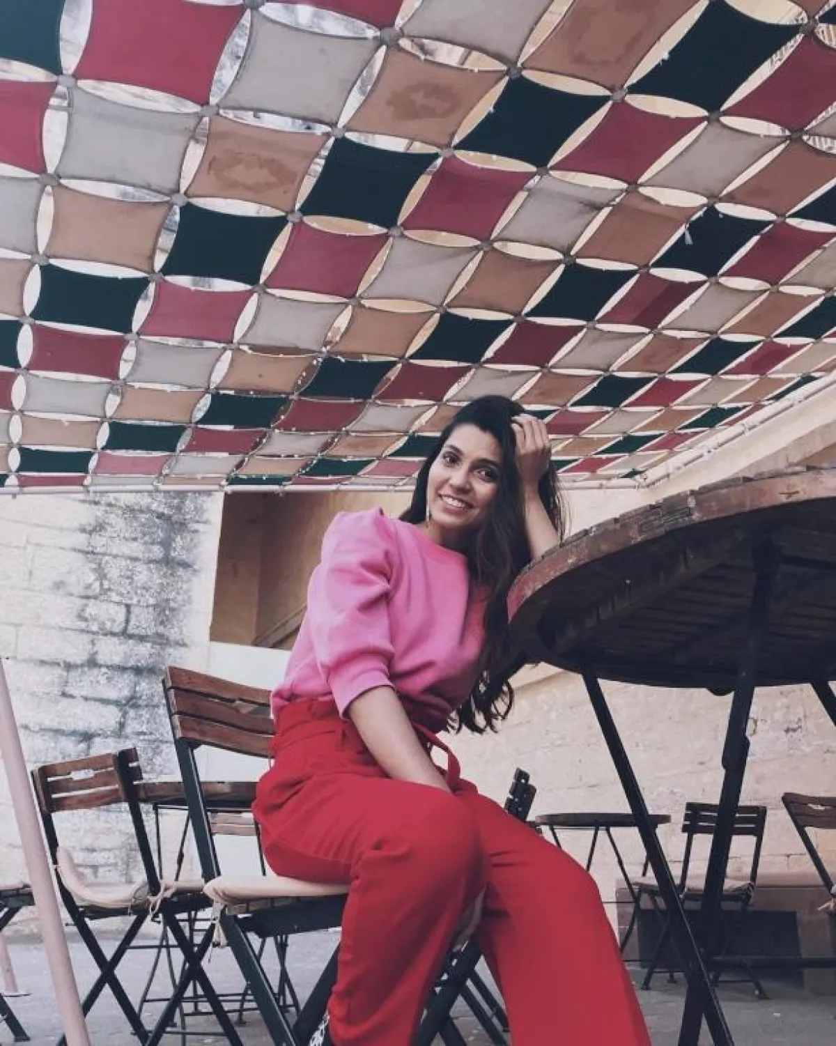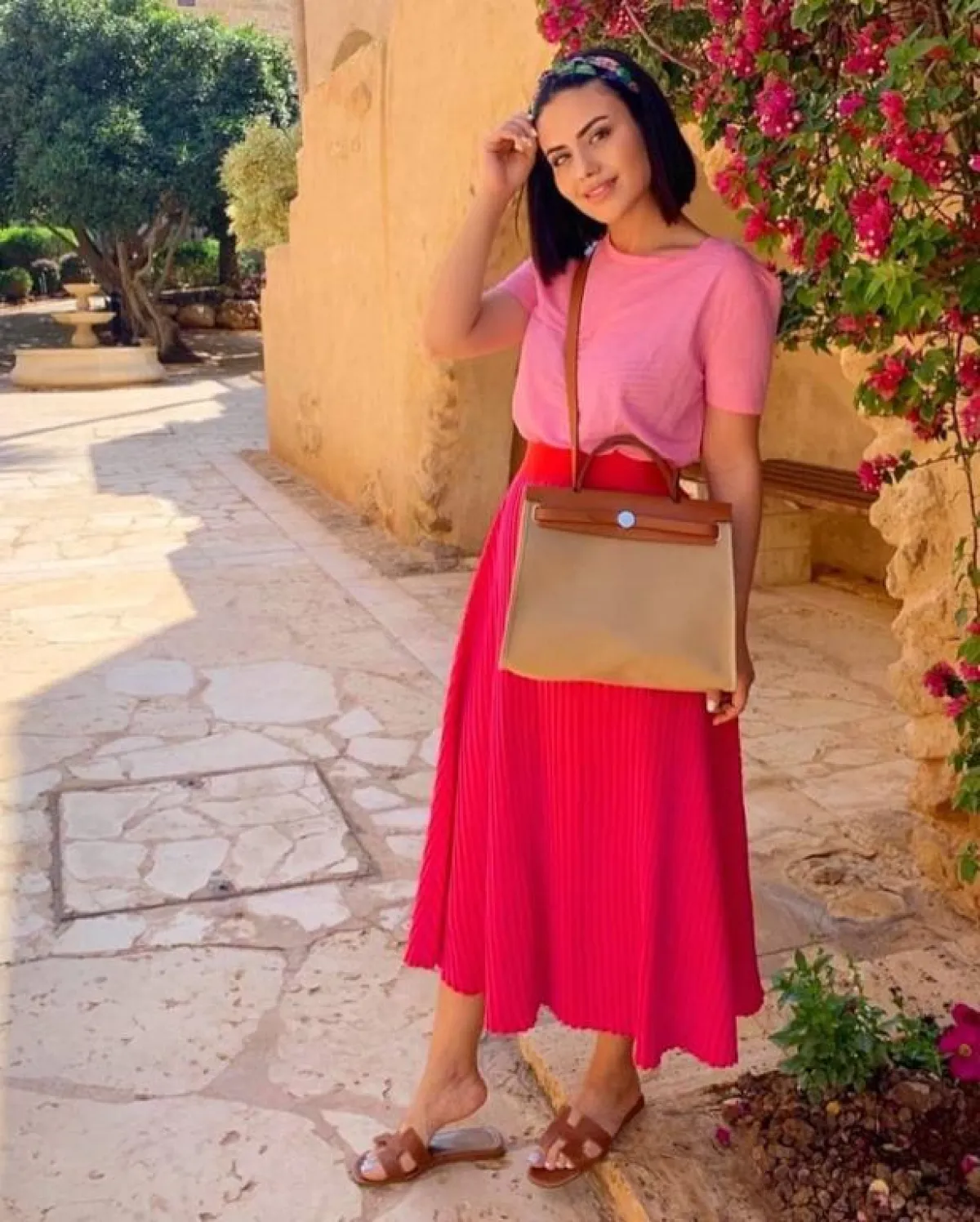 ظهرت مدونة الموضة العراقية ديما الأسدي بـ تنورة مكسرة باللون الأحمر، و نسقتها مع تي شيرت عصري باللون الوردي المتوسط، واختارت أن تنتعل صندل صيفي باللون الجملي، وهو اختيار عصري غير متوقع.