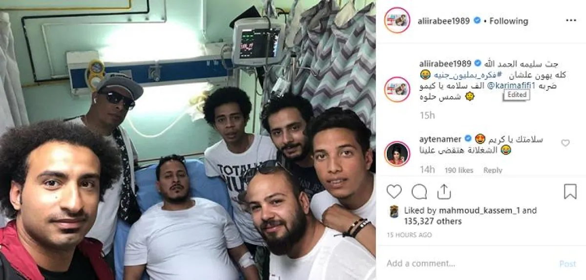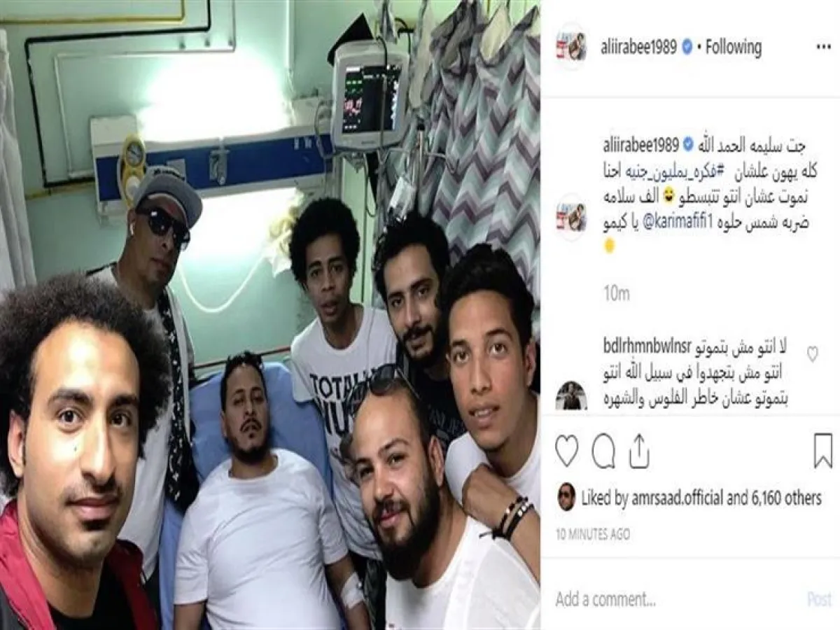 علي نشر صورة لكريم عفيفي داخل المستشفى محاطًا بنجوم مسلسل "فكرة بمليون جنيه"، عبر حسابه بموقع انستقرام، وعلق عليها قائلًا: جت سليمة الحمد الله، كله يهون علشان "فكرة بمليون جنيه"، إحنا نموت عشان إنتوا تتبسطوا، ألف سلامة يا كيمو ضربة شمس حلوة.
