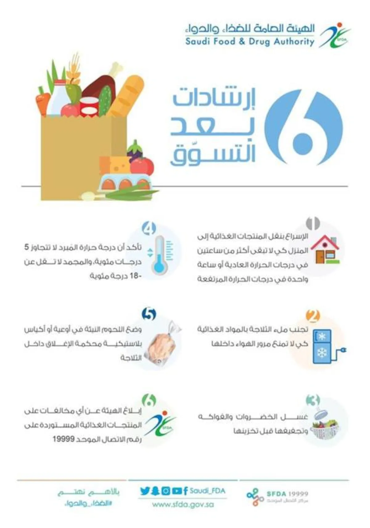 ونصحت الهيئة باتباع عددٍ من الإرشادات لضمان سلامة الأغذية بعد التسوق، منها، "الإسراع بنقلها إلى المنزل، وتجنب ملء الثلاجة بشكل يمنع مرور الهواء بداخلها، وغسل الخضراوات والفواكه وتجفيفها قبل تخزينها".