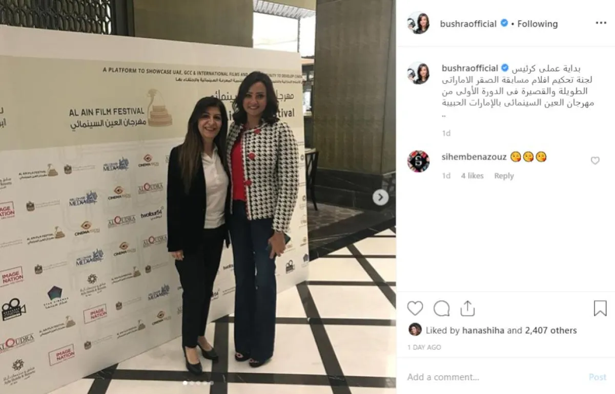 وبدأت بشرى نشر يوميات عملها ومشاركة جمهورها كواليس مهرجان العين السينمائي، عبر حسابها بموقع انستقرام، وعلقت على الصور قائلة: "بداية عملي كرئيس لجنة تحكيم أفلام مسابقة "الصقر الإماراتي" الطويلة والقصيرة فى الدورة الأولى من لمهرجان العين السينمائي بالإمارات الحبيبة".