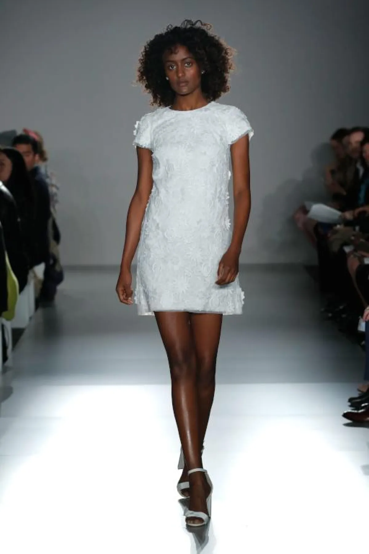 وقدمت بعض الماركات فساتين زفاف قصيرة بتنورة مغطاة بالريش، مثل الفستان بالأكمام القصيرة من جيني باكهام Jenny Packham، والفستان الحمّالات من نعيم خان Naeem Khan.