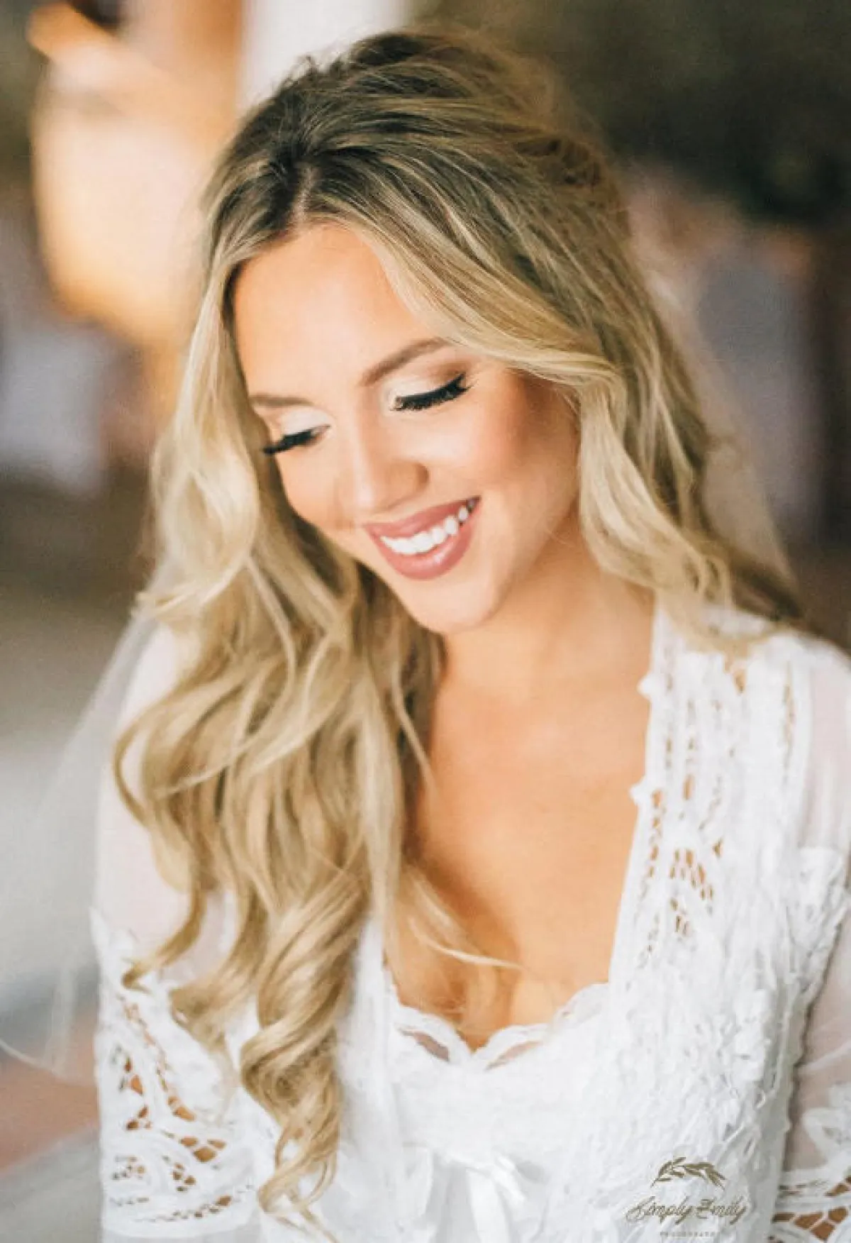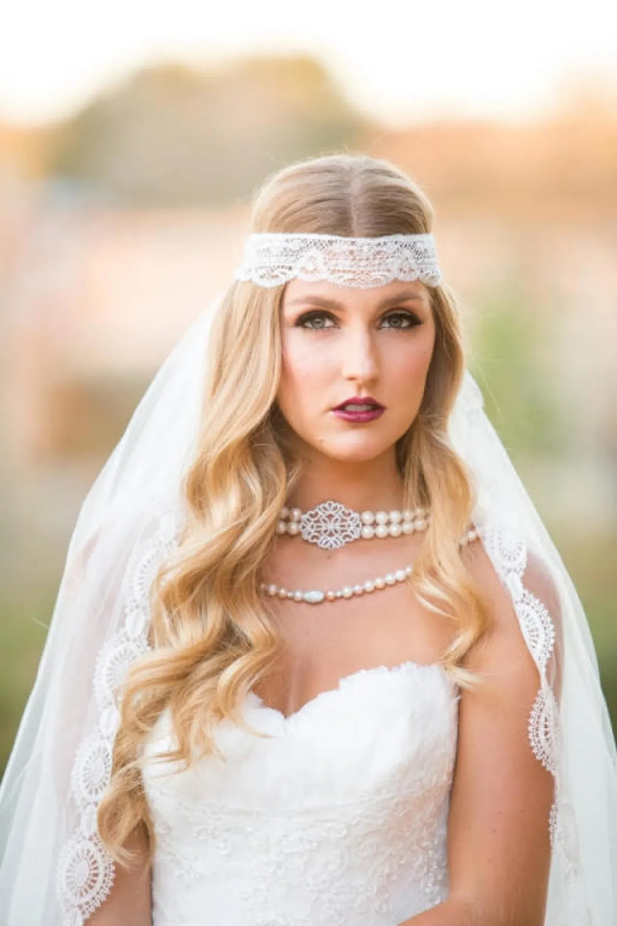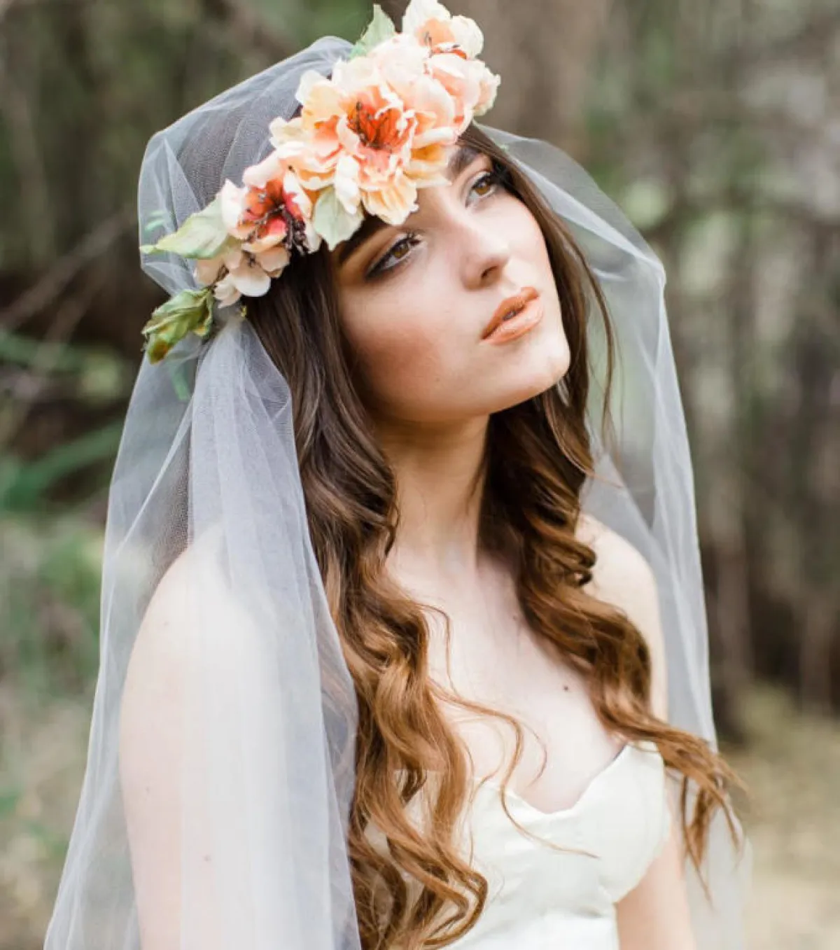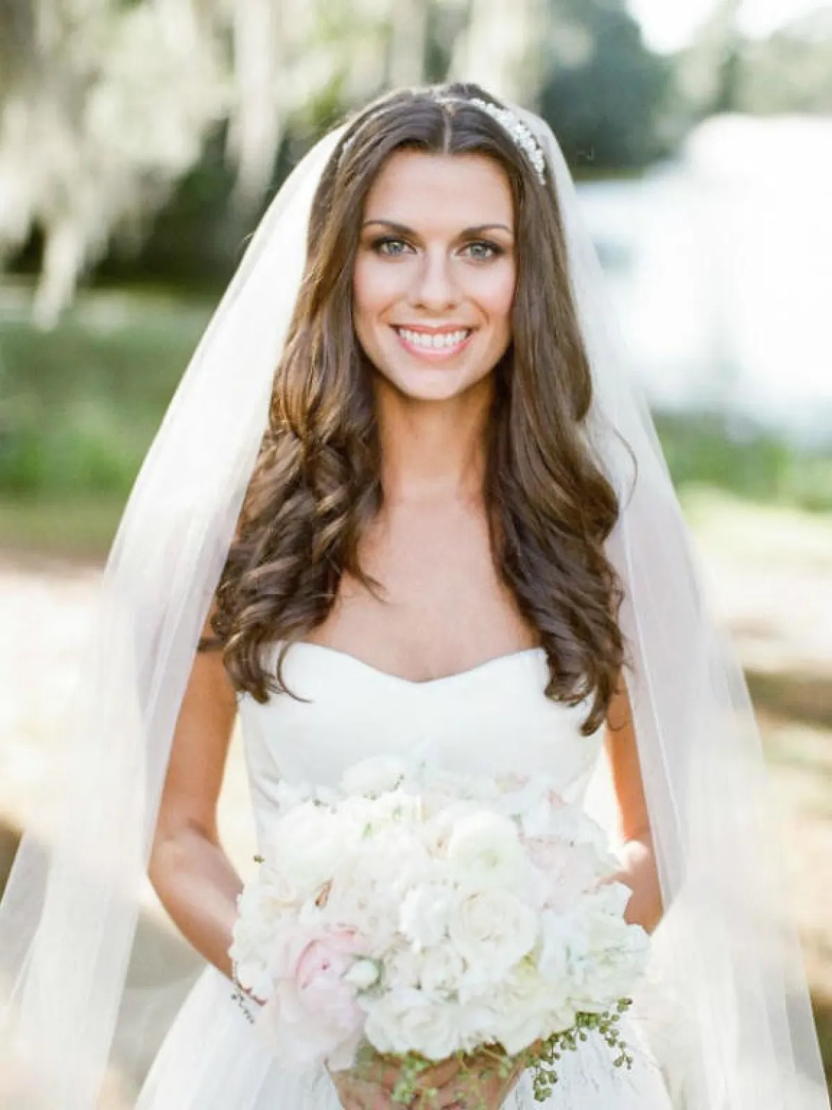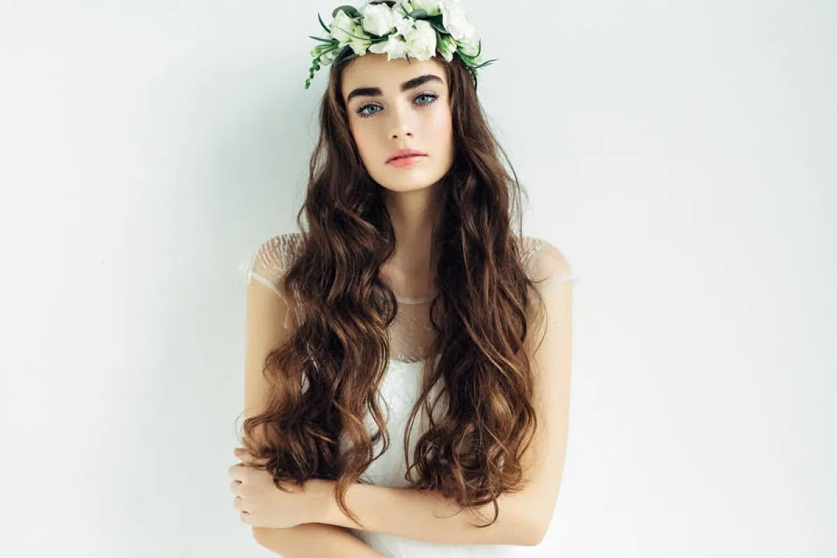 تسريحة الشعر المفرود مع خصلات الويفي، اعتمديها لتمنحكِ مظهرًا أكثر كثافة لشعرِك، كما أنها من تسريحات الشعر الرائجة، اعتمديها مع الفرق من المنتصف، وتاج الرأس الفخم، وطرحة بسيطة شفافة وخفيفة حتى لا تخفي تسريحة شعركِ المفرودة.