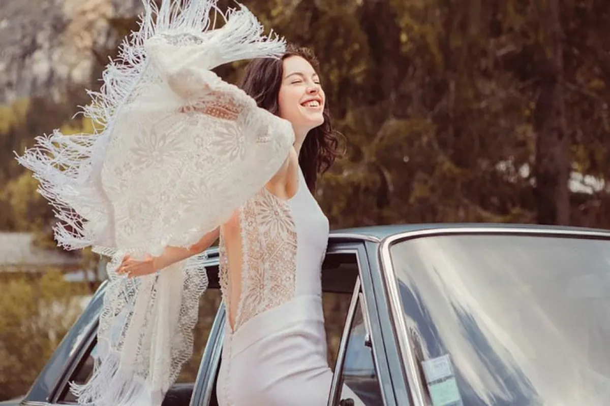 أما إن كنتِ تحبين تصميمًا بتفاصيل منتعشة أكثر، بخاصة وإن كان حفلكِ بموسم الربيع، فهذا التصميم مع تطريزات الشراشيب سيكون مثاليًّا لذوقِك ولما تبحثين عنه، من تصميم Elise Hameau فساتين زفاف من تصميم إليزي هامي.