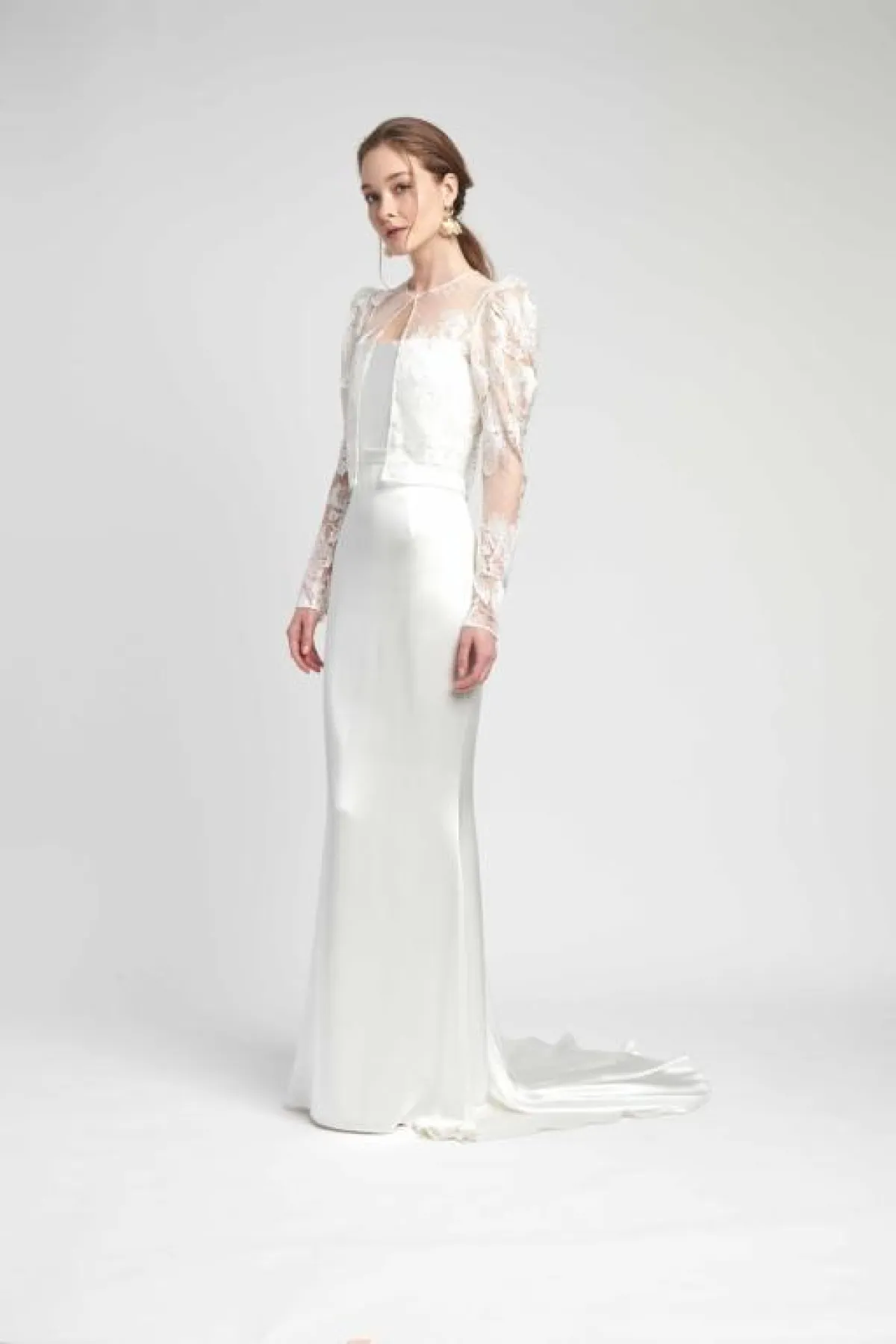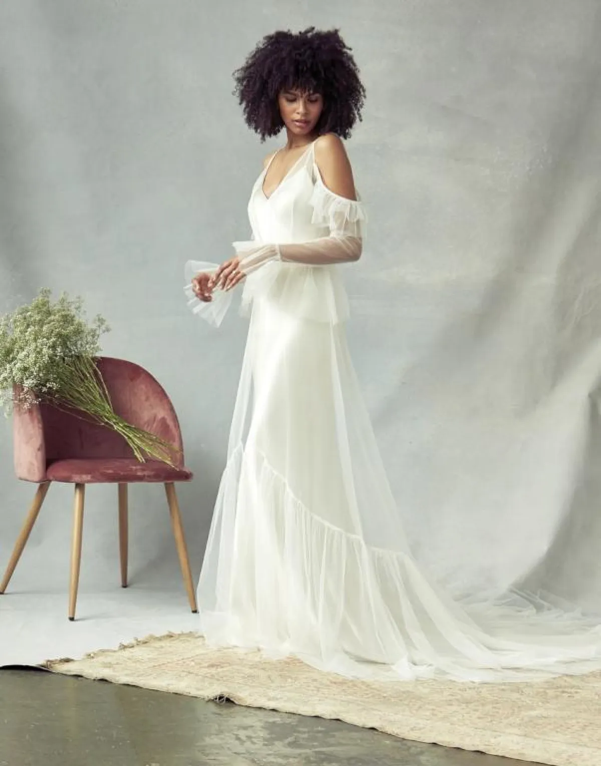 أعجبنا الفستان مع تصميم الكاب المنسدل من خامة التول، وإطار مميز مطرز من الدانتيل، مناسب لكِ إن كنتِ تبحثين عن لوك كلاسيكي، بخاصة للمتلئات من الجزء العلوي.