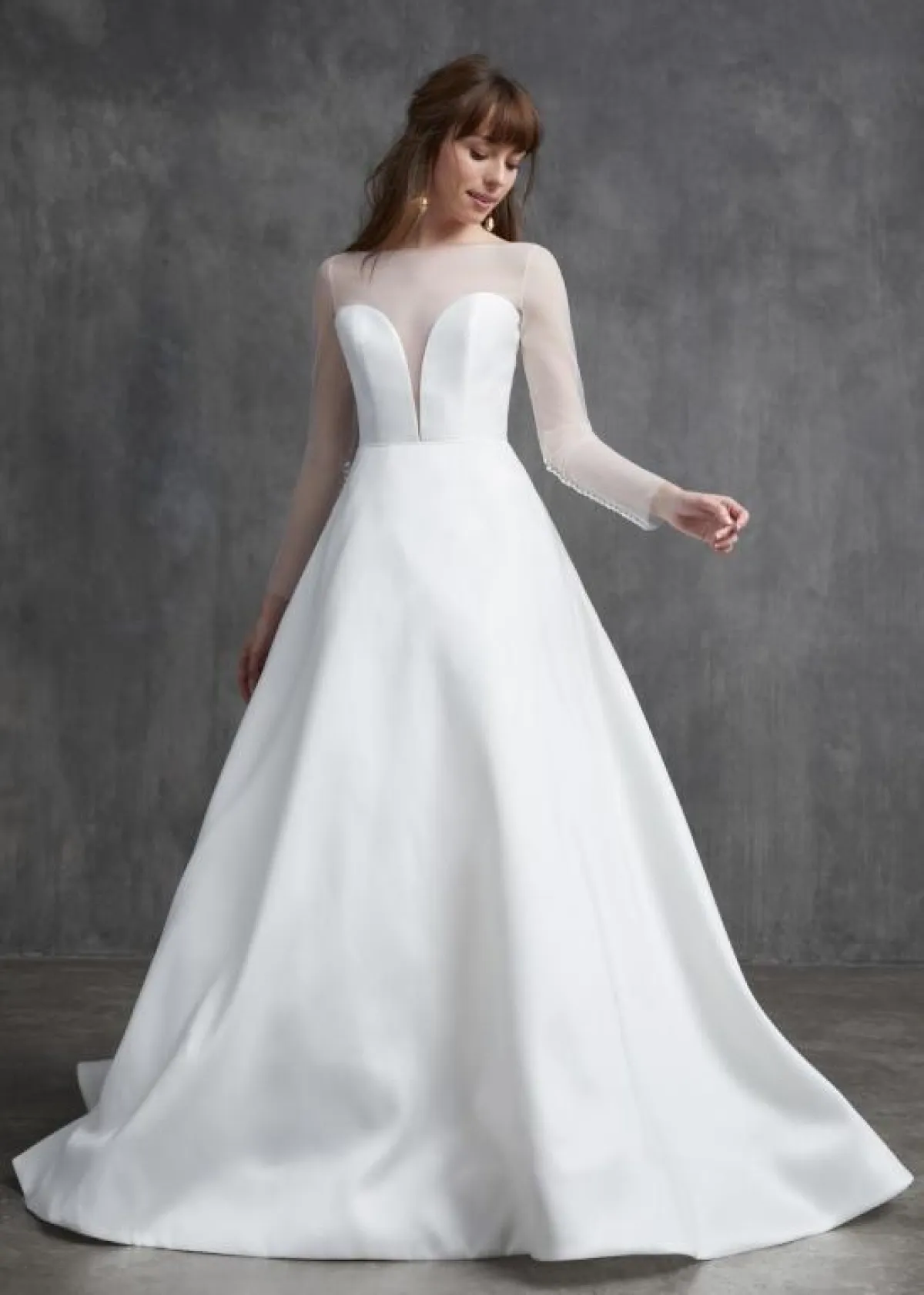 الفستان المنفوش مع خامة الساتان المخملية، سيمنحكِ اطلالة ملكية من الدرجة الأولى، مع الأكمام الطويلة الشفافة، إن كنتِ تبحثين عن لوك محتشم، أو كنتِ تحبين الأكمام الشفافة.