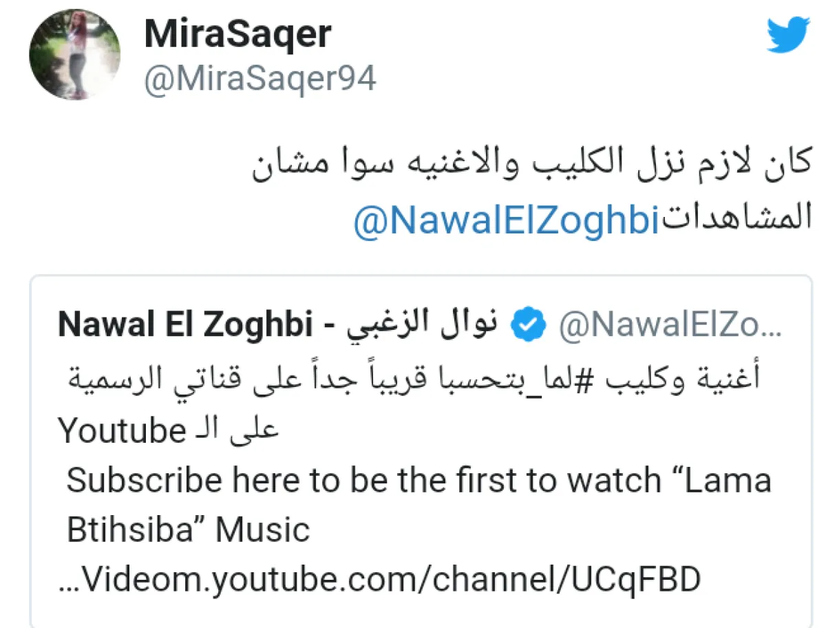 متابعو نوال الزغبي وإليسا، يترصّدون لأي تغريدة تنشر على حساب إحداهما، ويقومون بتحليلها وإبراز الجانب الخفي الذي يقف وراء نشرها، ثم يستنتجون أنها موجّهة إلى فنانتهم المفضلة، وهذا ما حصل عندما نشرت الفنانة نوال الزغبي تغريدة أشارت فيها الى طرح أغنية وقرب طرح كليب "ما بتحسبا" شارة مسلسل "بروفا" لـ بو غصن بطولته مع أحمد فهمي، فما كان من أحد المتابعين إلا أن علق عليها "كان لازم نزل الكليب سوا منشان عدد المشاهدات". هذا التعليق لم يرق لنوال الزغبي، فردت عليه بتغريدة هجومية قالت فيها "في ناس بتحفظ عدد المشاهدين بس ما بيقدروا يحفظوا الأغنية وبتتنسى على مرّ السنين. بس النجاح هي أنو الكل يرددا ويغنيا وشكرا".