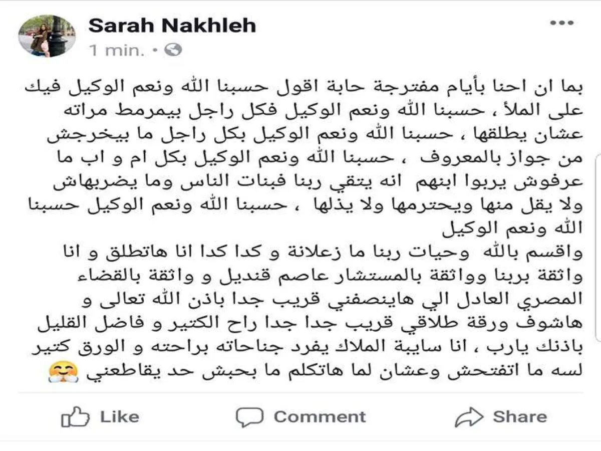 سارة نخلة كتبت عبر حسابها الخاص بموقع الفيس بوك: بما إن احنا بأيام مفترجة، حابّة أقول حسبنا الله ونعم الوكيل فيك على الملأ، حسبنا الله ونعم الوكيل في كل راجل بيمرمط مراته عشان يطلقها، حسبنا الله ونعم الوكيل بكل راجل ما بيخرجش من الجواز بالمعروف، حسبنا الله ونعم الوكيل بكل أم وأب معرفوش يربوا ابنهم إنه يتّقي ربنا في بنات الناس، وما يضربهاش ولا يقل منها ويحترمها ولا يذلها، حسبنا الله ونعم الوكيل حسبنا الله ونعم الوكيل.