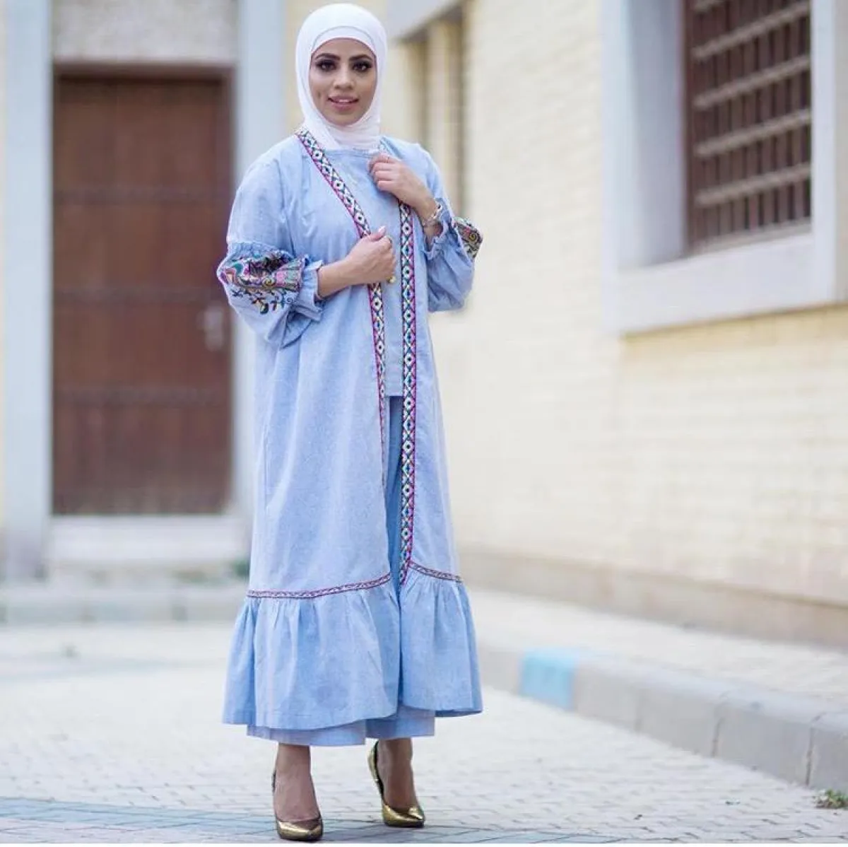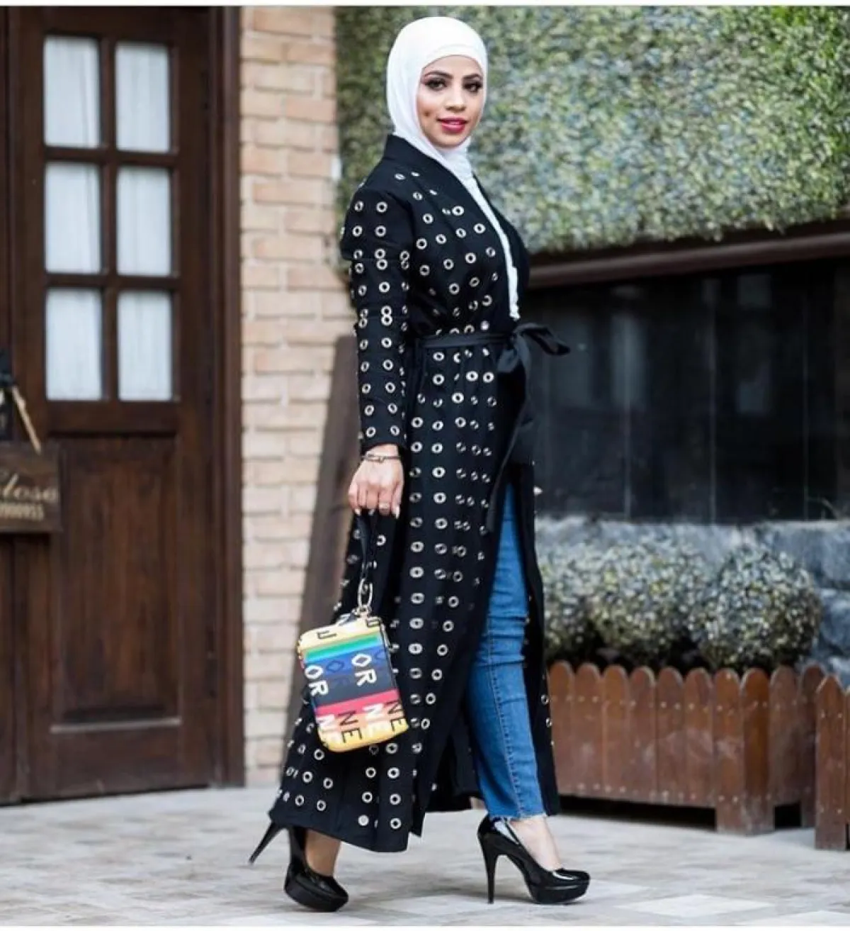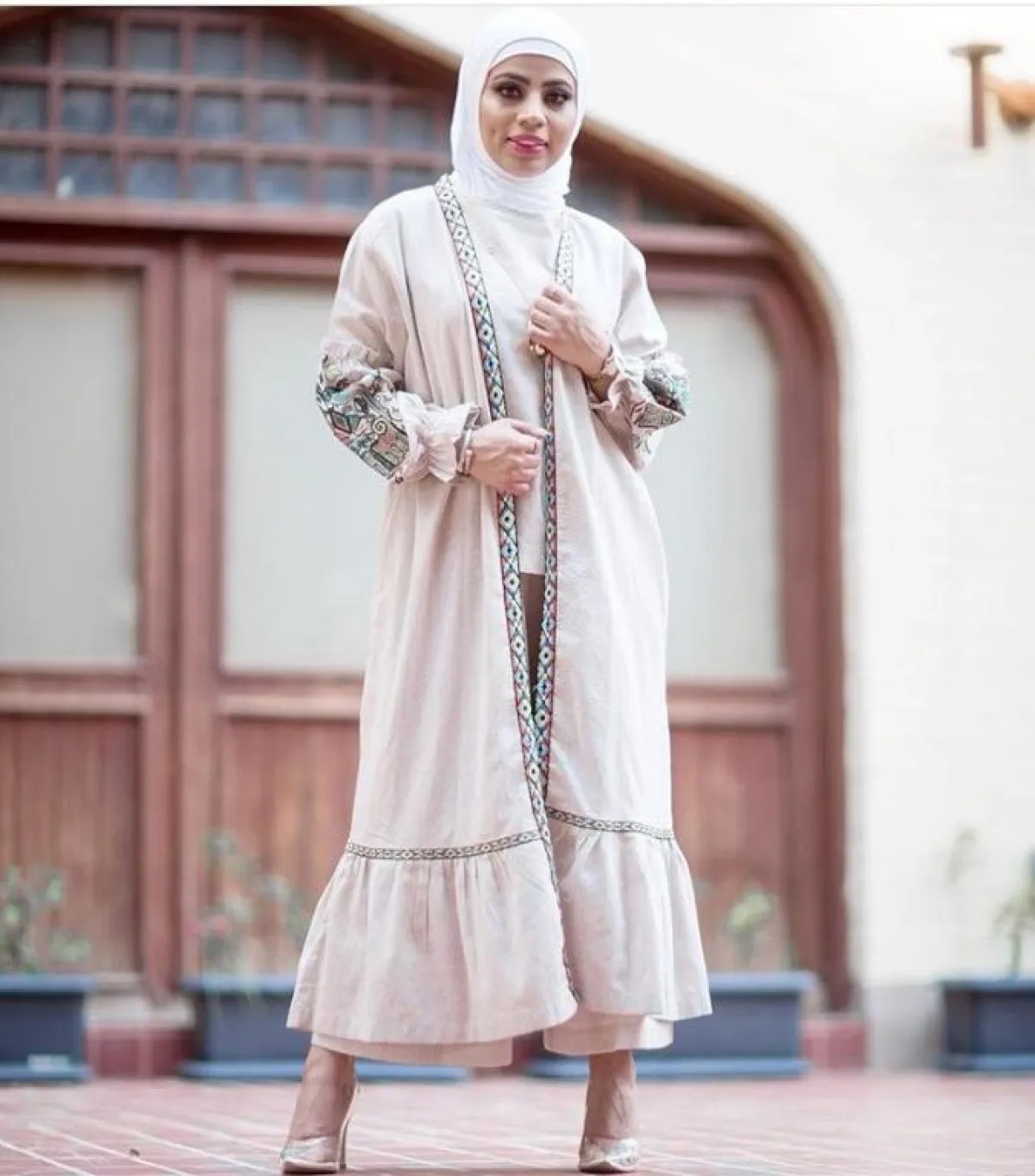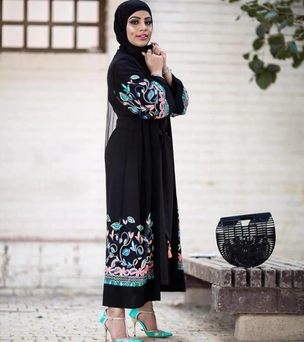 العباية البيبي بلو، مع الرسومات الفلكلورية الملونة، من الصيحات الرائجة بشكل كبير، وتناسب أكثر الصبايا المحجبات المراهقات، والكشكشة على الجزء السفلي للعباية، جعلت التصميم يبدو أكثر عصرية، اختاري معها الحجاب الأبيض، ولكننا لا ننصحكِ باعتماد الحذاء الذهبي الذي اختارته فاطمة، فسيناسبها اكثر الأحذية الكاجوال أو الصنادل المفتوحة، للتناغم مع فكرة تصميم العباية.