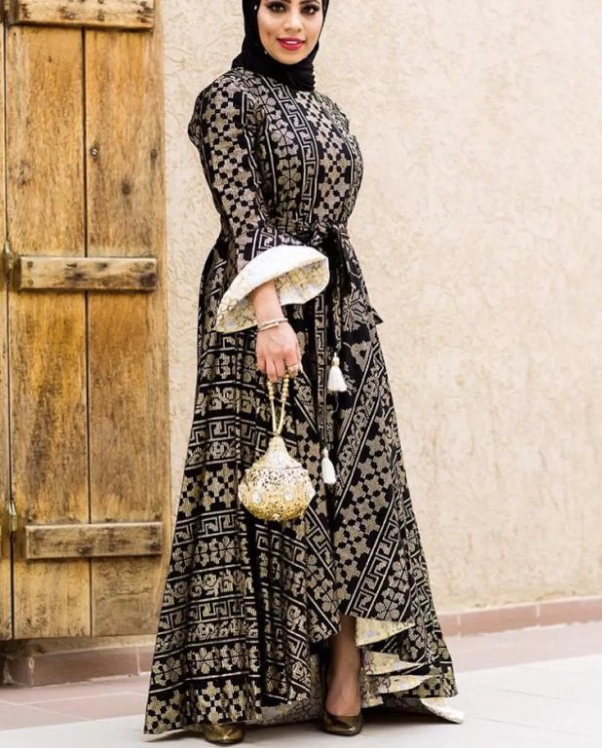 أما العباية الفستان مع حزام الخصر والكشكشة، سيناسبها أكثر الكعب العالي، ومناسبة للفتيات قصيرات القامة، بخاصة وأنّ العباية بتصميم قصير من الأمام، وسيكون الحجاب الأسود ملائمًا، أما إذا أحببتِ اطلالة لافتة للنظر أكثر، فاختاري الحجاب الذهبي، مع الكلتش الأسود.