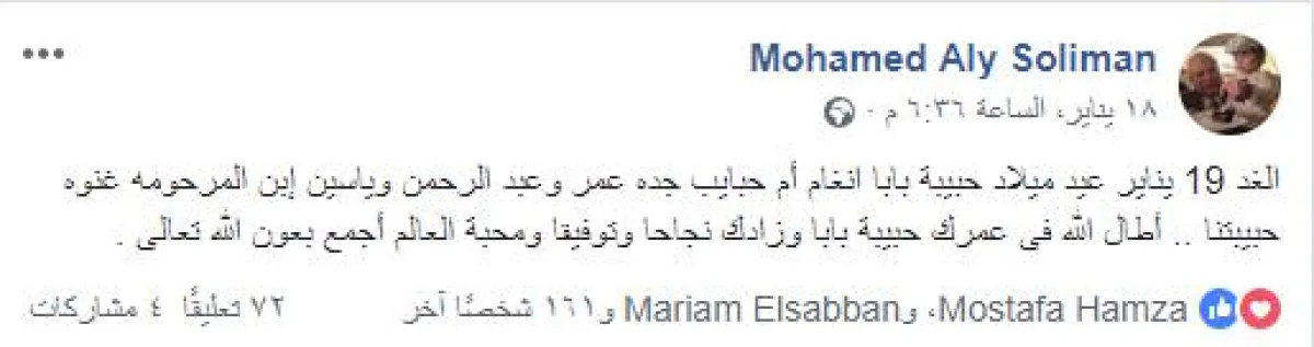 محمد علي سليمان رغم إعلانه الصلح مع ابنته أنغام منذ سنوات، لم يكن يبادر بتهنئتها في المناسبات العامة، ولكنّ العام الحالي أصرّ على الاحتفال بيوم ميلادها، برسالة مؤثرة جدًّا عبر حسابه الخاص بموقع الفيسبوك قال فيها: 19 يناير عيد ميلاد حبيبة بابا أنغام أم حبايب جده عمر وعبد الرحمن وياسين ابن المرحومه غنوة حبيبتنا.