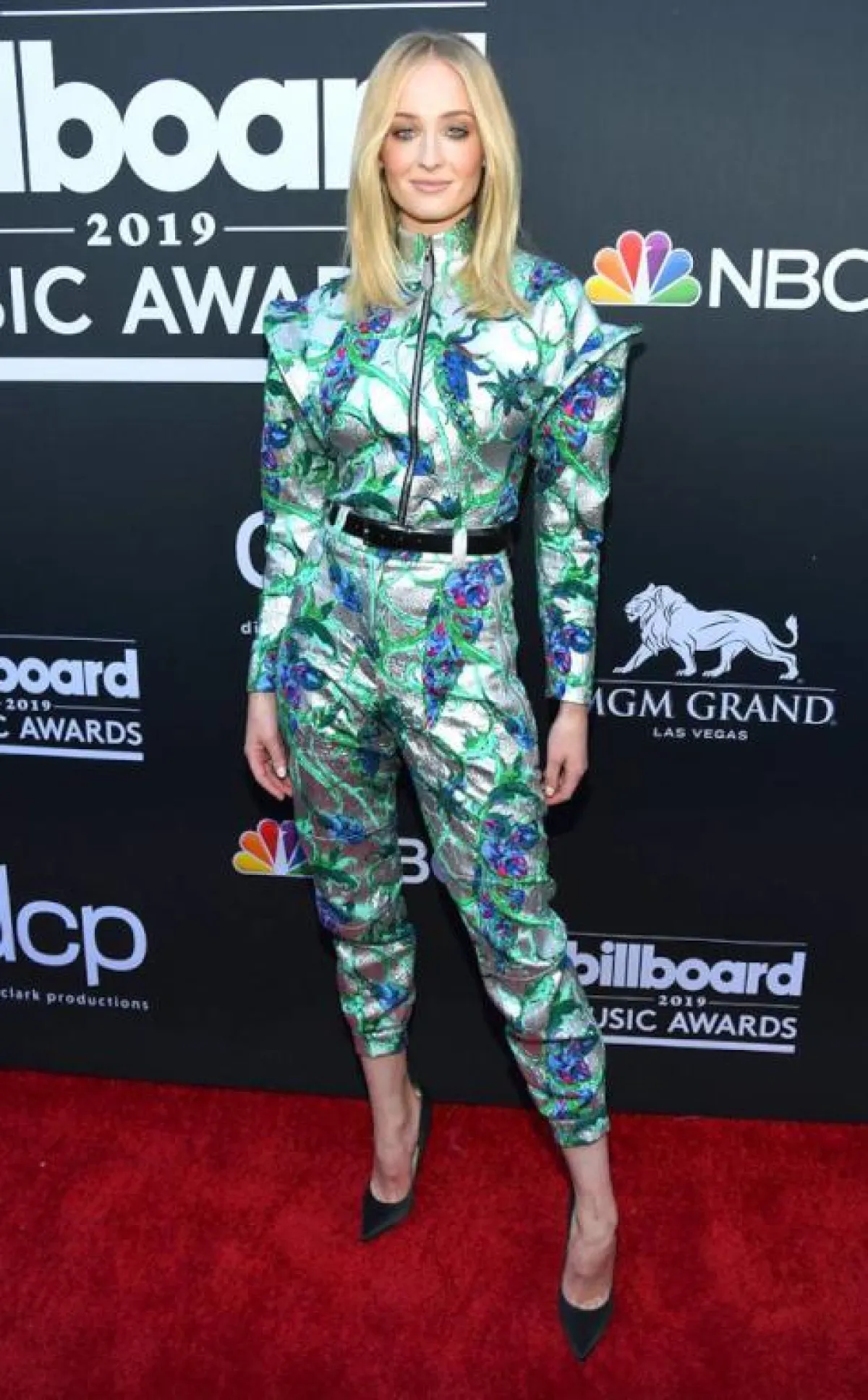 صوفيا تيرنر Sophie Turner بطلة مسلسل “صراع العروش” Game of Thrones اختارت اطلالة عصرية في جمبسوت من “لويس فويتون” Louis Vuitton قماشه ميتالك معرق برسومات الورود، وقد زينت خصرها بحزام من الجلد الأسود، وأكملت اللوك بحذاء ذي كعب عالٍ بقص كلاسيكية أنيقة.