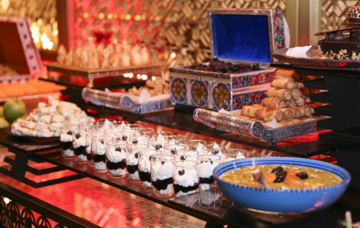 سيحظى الضيوف بفرصة اختيار "بوفيه" الإفطار اليومي الشهي الذي يشمل الأطباق العربية المُحضَّرة خصِّيصًا لهذا الشهر، بدءًا من سلطات الخضراوات والمقبِّلات العربية، بما في ذلك الحمُّص والفتُّوش وسلطة الجرجير وورق العنب وسلطة القرنبيط مع صلصة الطحينة، في مُقابل 185 درهمًا. أمَّا منصَّات الطهو الحيَّة فتُقدِّم تشكيلة من المشاوي الشرقيَّة اللذيذة وأوزي لحم الضأن وشاورما الدجاج، أو المقبِّلات العربية الساخنة وغيرها. ويتولَّى الطهاة الموهوبون، بإشراف الطاهي التنفيذي حمزة صفاف الذي عُيِّن أخيرًا، إعداد مجموعة من الأطباق العربيَّة المميَّزة خصيصًا للـ"بوفيه"، مثل: هريسة لحم الضأن، ومندي الدجاج المدخَّن، وكفتة لحم الضأن، والكبة باللبن الشهيَّة، إلى جانب مجموعة مختارة من المشروبات الرمضانية المنعشة.