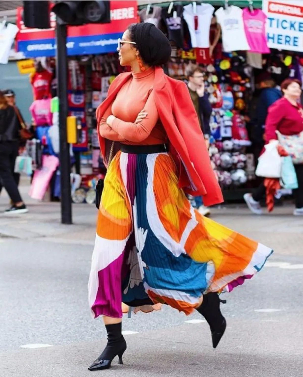 الألوان الفاقعة واللافتة أسلوب أصبحت تعتمده كثير من الفاشينيستات بهذه الأيام، أنتِ أيضاً يمكنك اعتماده بهذه الطريقة من وحي صوفيا، بارتداء التنورة الملونة، مع التوب البرتقالي الفاقع، والبليزر بنفس درجات الألوان، وستكسرين حدة الألوان بالبوت ذا الكعب القصير.