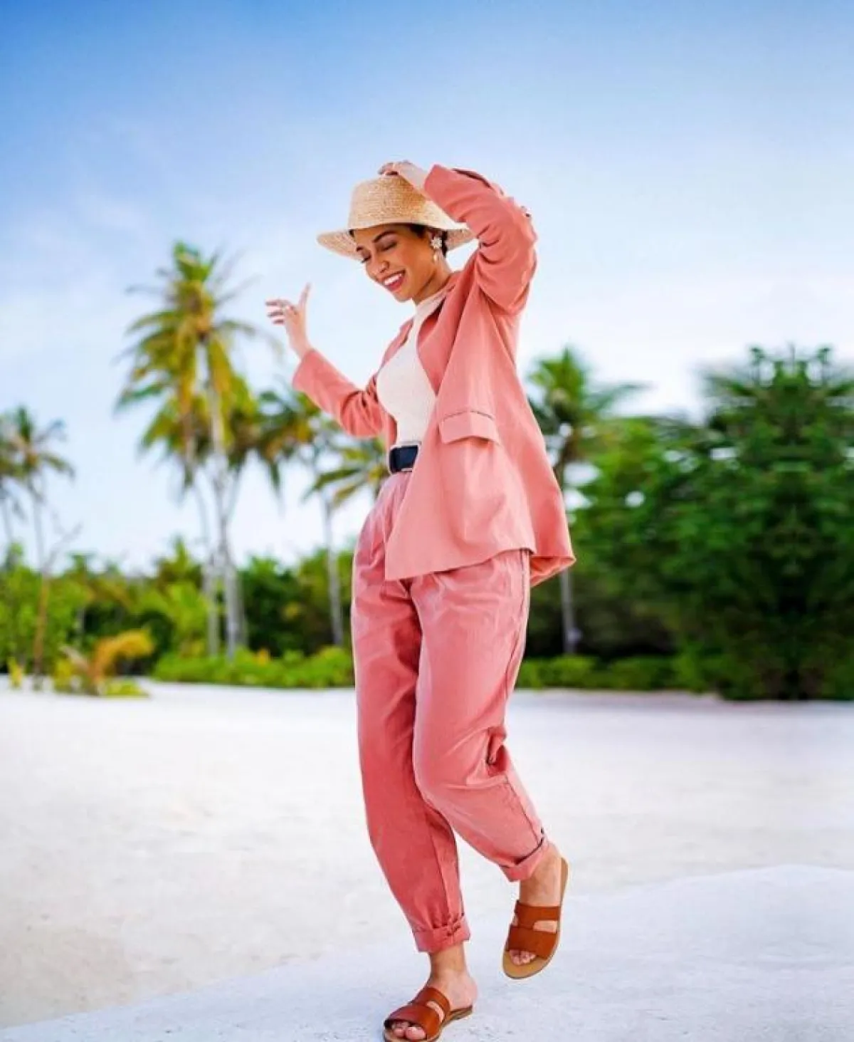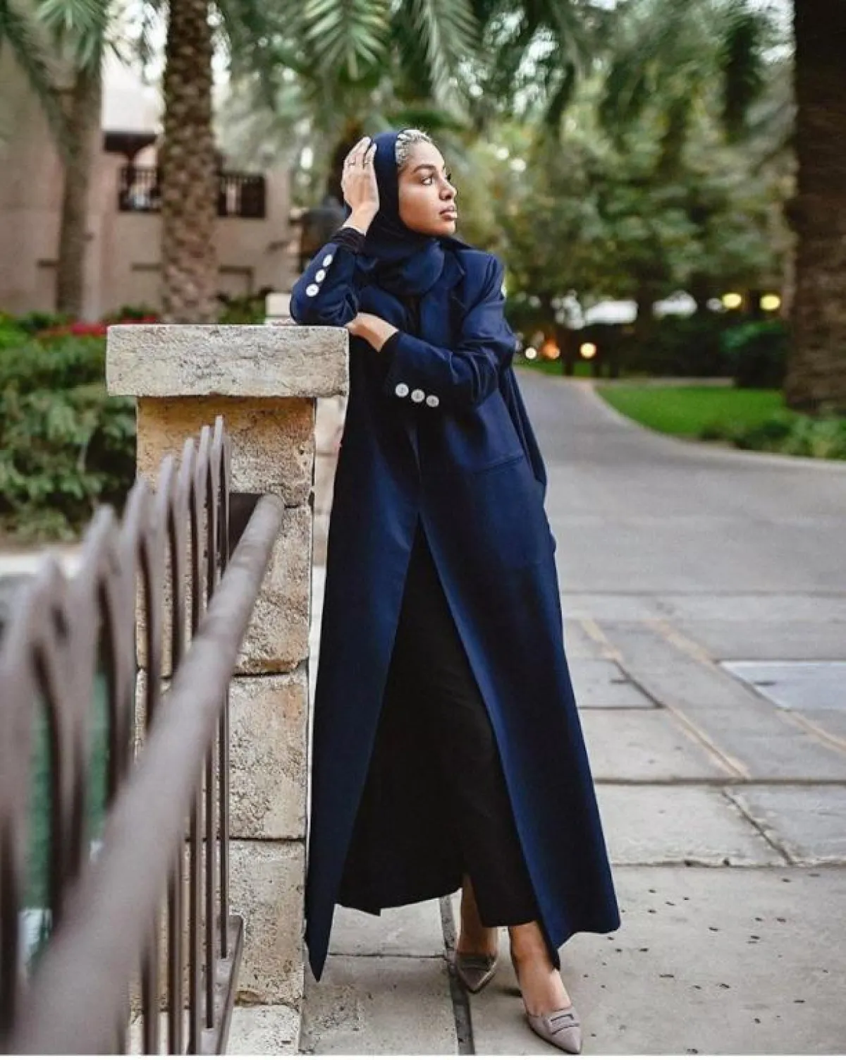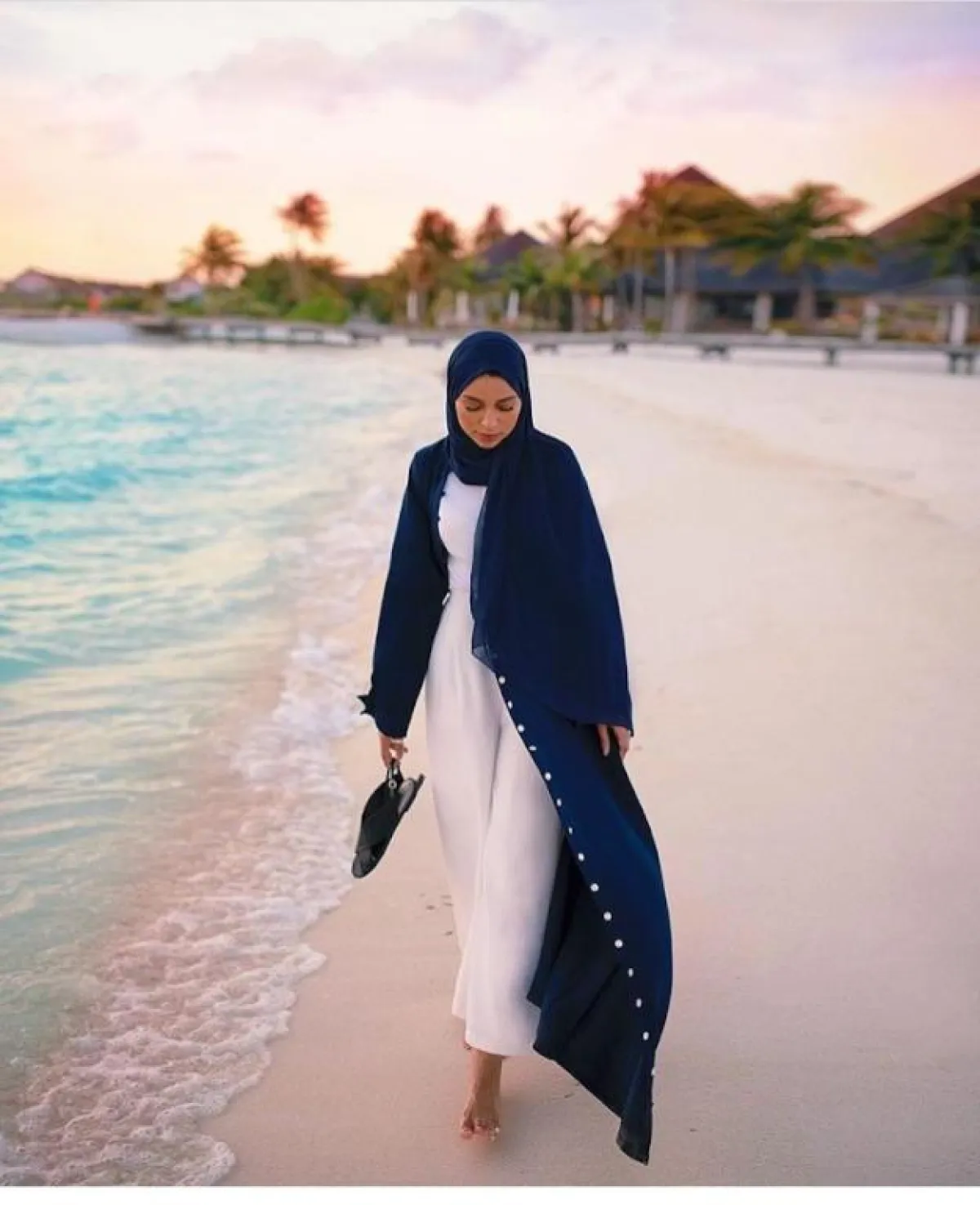 بينما وجدناها بإطلالة أخرى بالعبايه المفتوحة مع الفستان الأبيض، لإطلالة هادئة على الشاطيء، نسقت معها حجابها باللون الكحلي الزهري، بدت أنيقة وطبيعية وغير متكلفة.