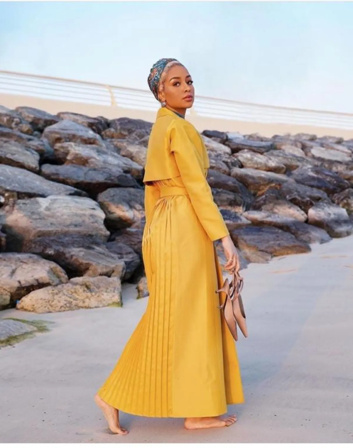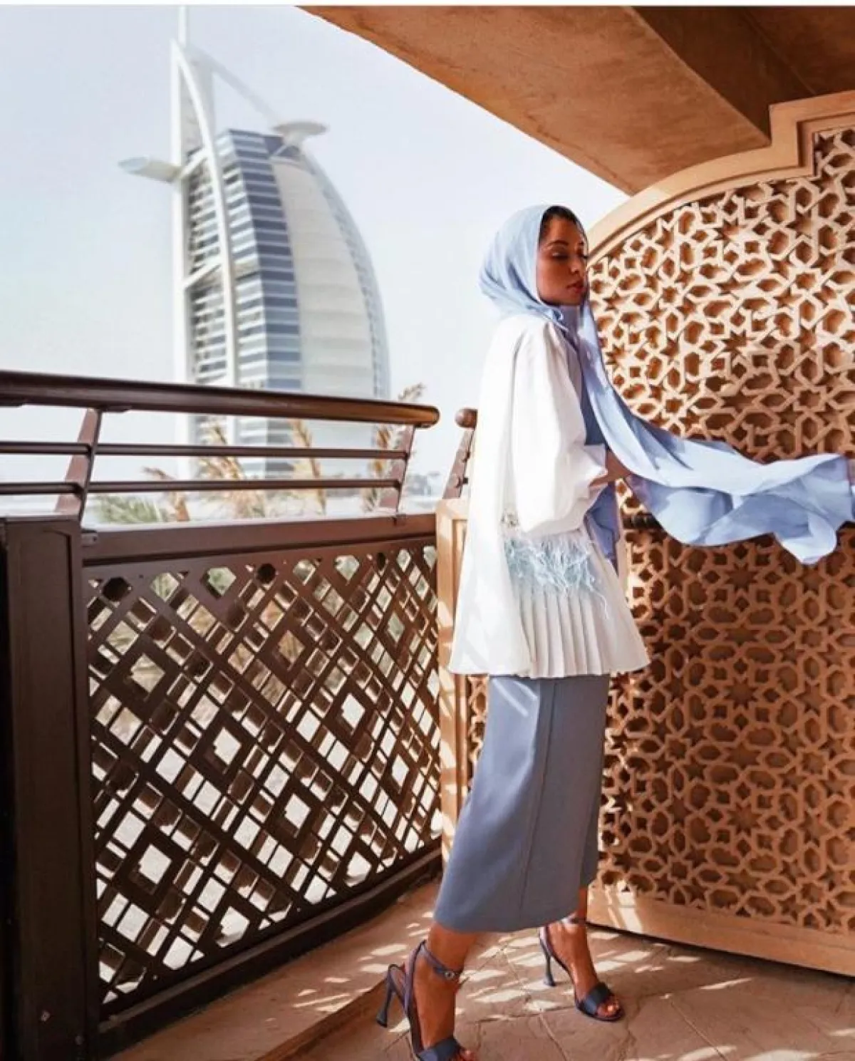 التنانير الطويلة الميدي مع البلوزات الواسعة، من الصيحات التي تعتمدها صوفيا جودسون خاصة عندما تكون بأحد البلاد العربية لإطلالة شرقية من الطراز الأول، كهذا اللوك باللون البيبي بلو، مع البلوزة البيضاء، ولفة الحجاب بدرجات البيبي بلو.