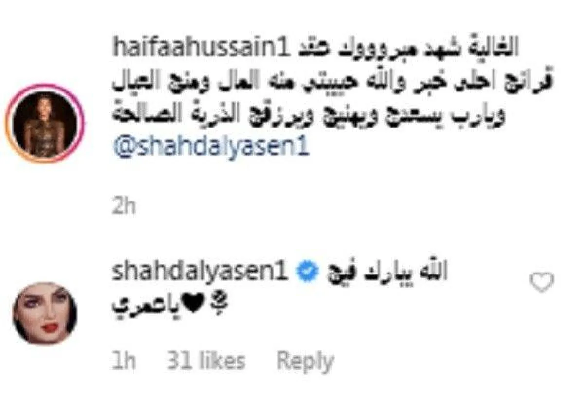 فاجأت الممثلة هيفاء حسين الجمهور بنشر تهنئة للممثلة العراقية شهد الياسين، وأرفقت صورة العروس بتعليق: "الغالية شهد مبروووك عقد قرانج، أحلى خبر والله حبيبتي منه المال ومنج العيال، ويارب يسعدج ويهنيج ويرزقج الذرية الصالحة". بعدها انهالت التعليقات المباركة للعروس شهد الياسين، التي لم تكشف عن هوية زوجها، وأكدت زواجها من خلال تعليقها بالشكر على منشور الفنانة هيفاء حسين.