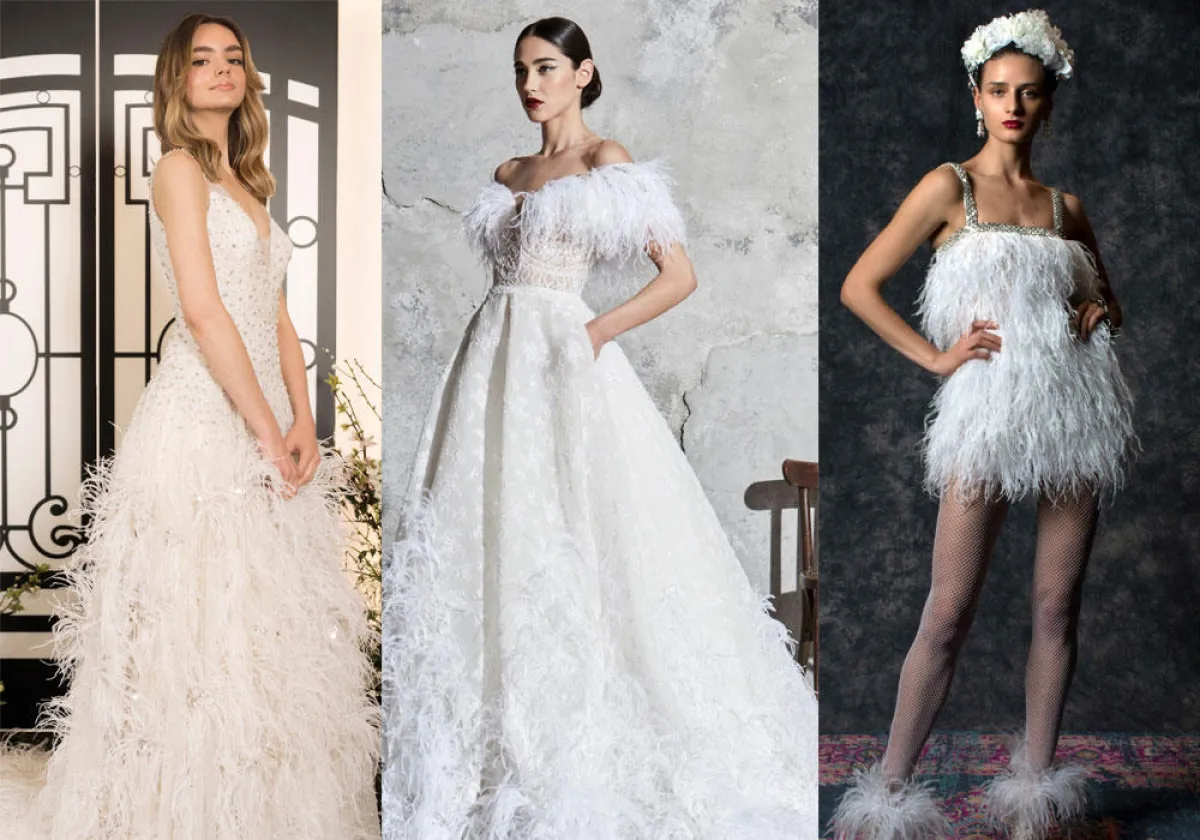 تعد الفساتين المزينة بالريش من أبرز صيحات أثواب العروس لعام 2020، فقد ظهرت في تصاميم متنوعة وجذابة لتناسب مختلف أذواق الفتيات.