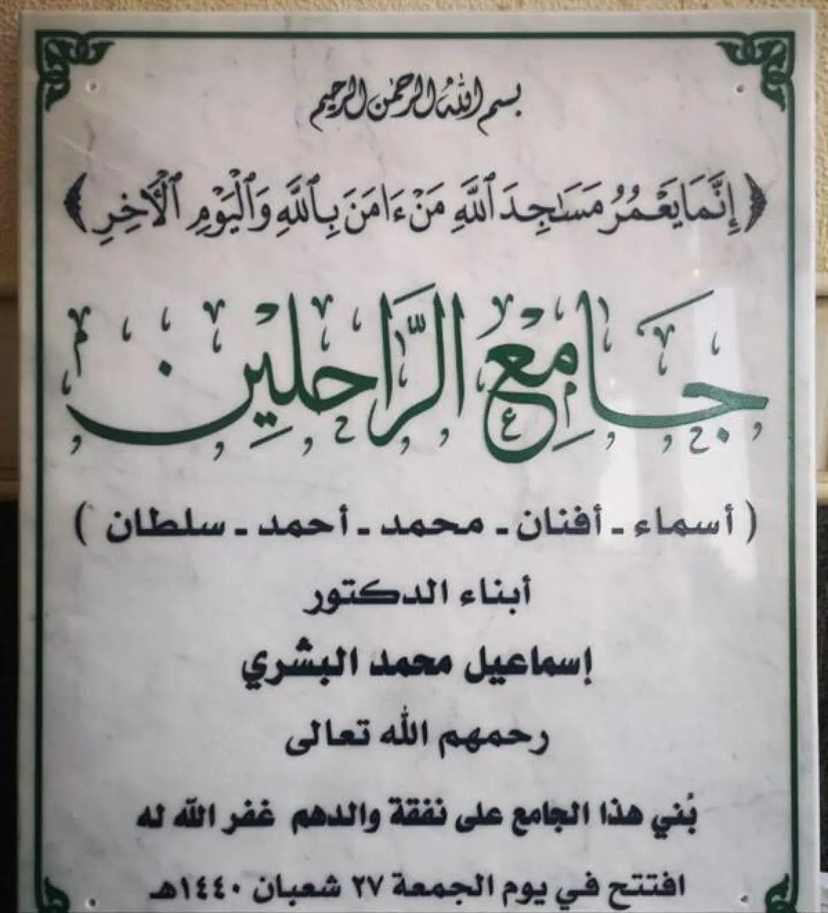 ولإيمان "البشري" بقضاء الله وقدره لم يكن يملك إلا أن يصبر ويحتسب مصابه عند الله _عز وجل_، ويفكر بعمل خيري يعود أجره وثوابه إلى أبنائه الخمسة فما كان منه إلا أن بنى "جامع الراحلين" بحي الموظفين بأبها، والذي افتتحه يوم أمس الجمعة.