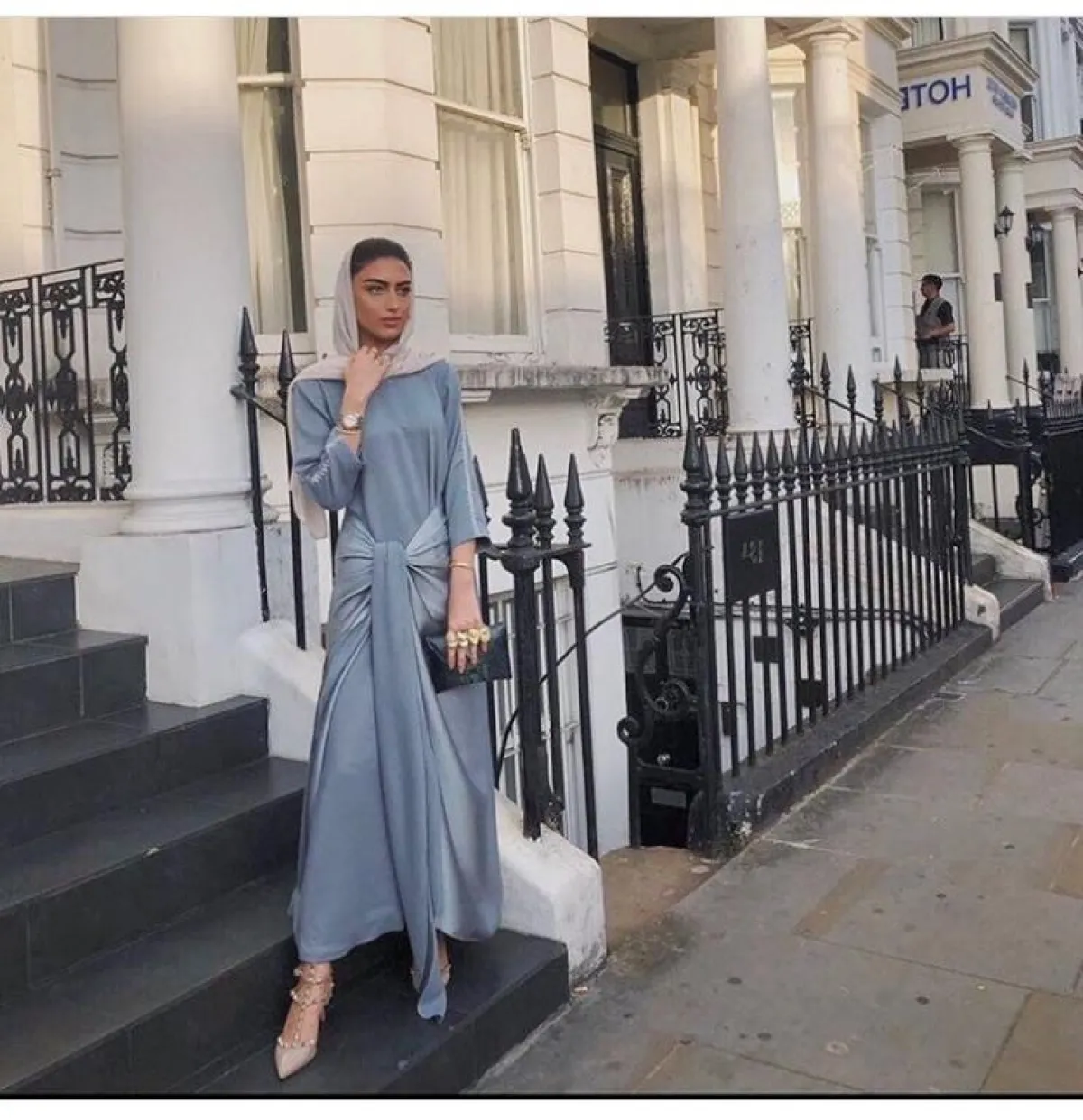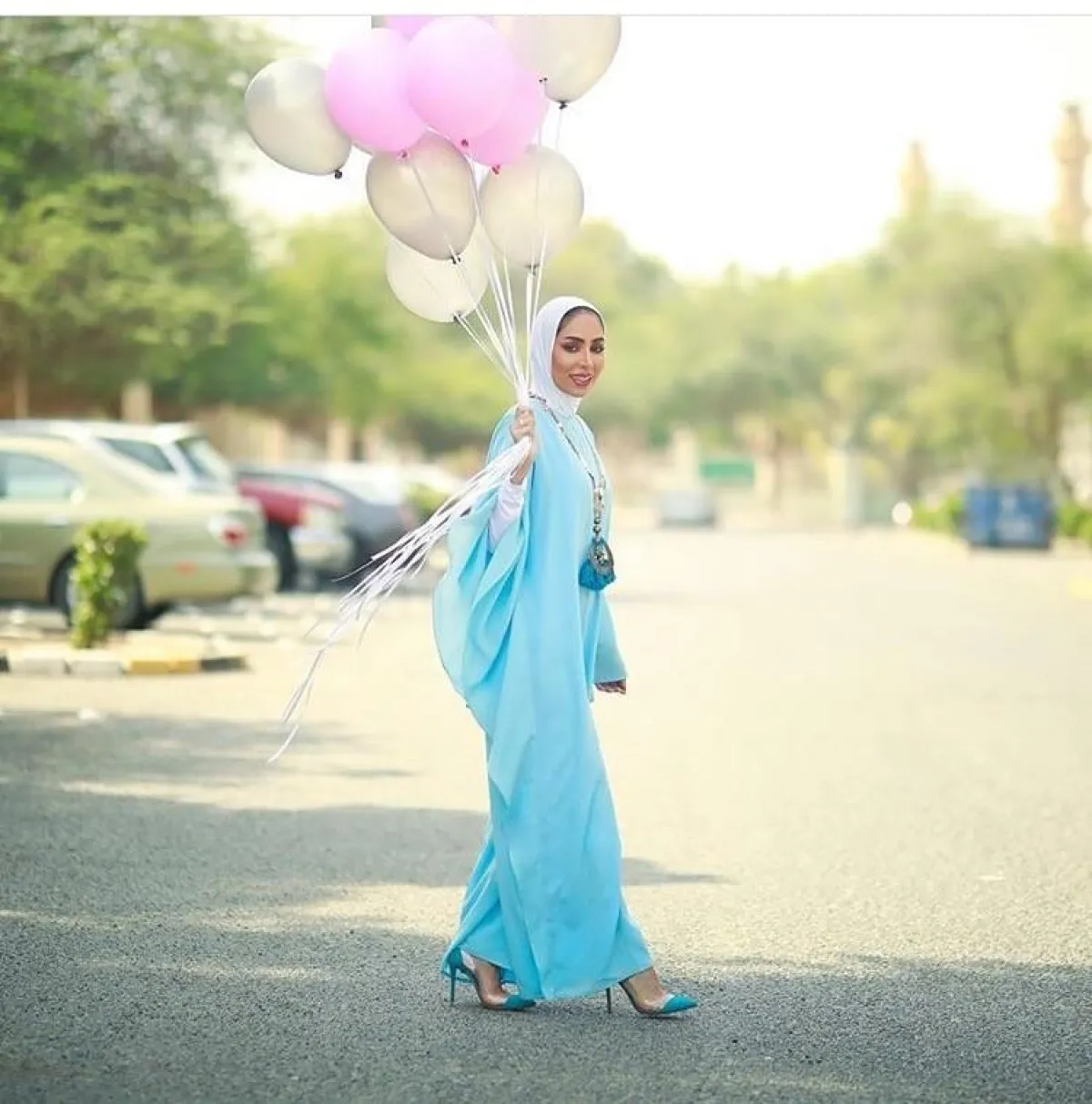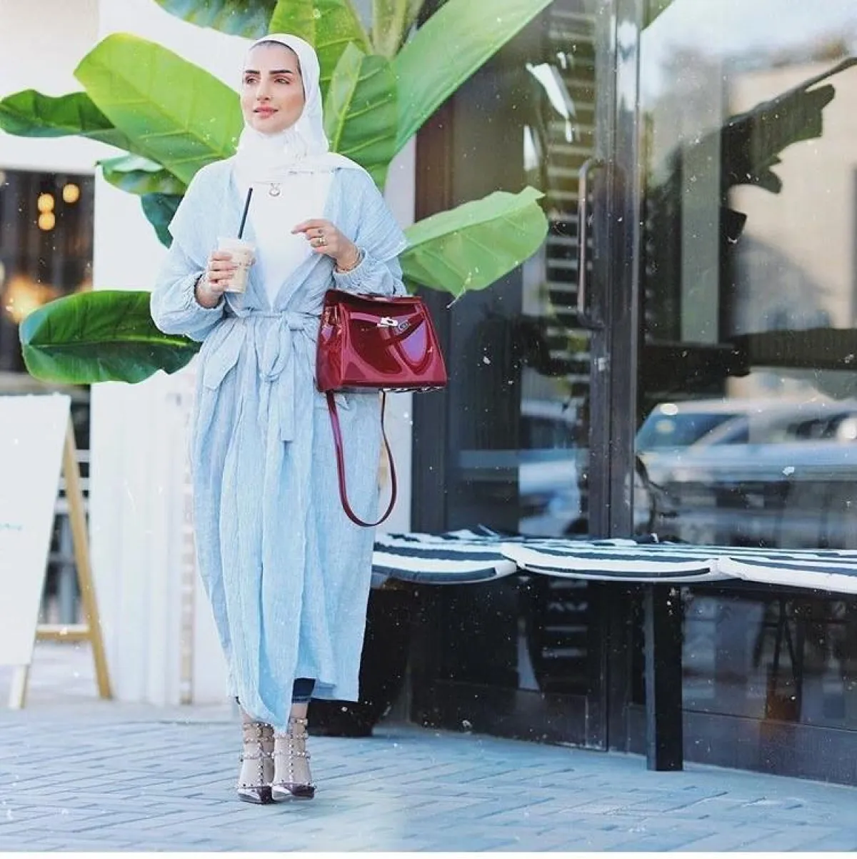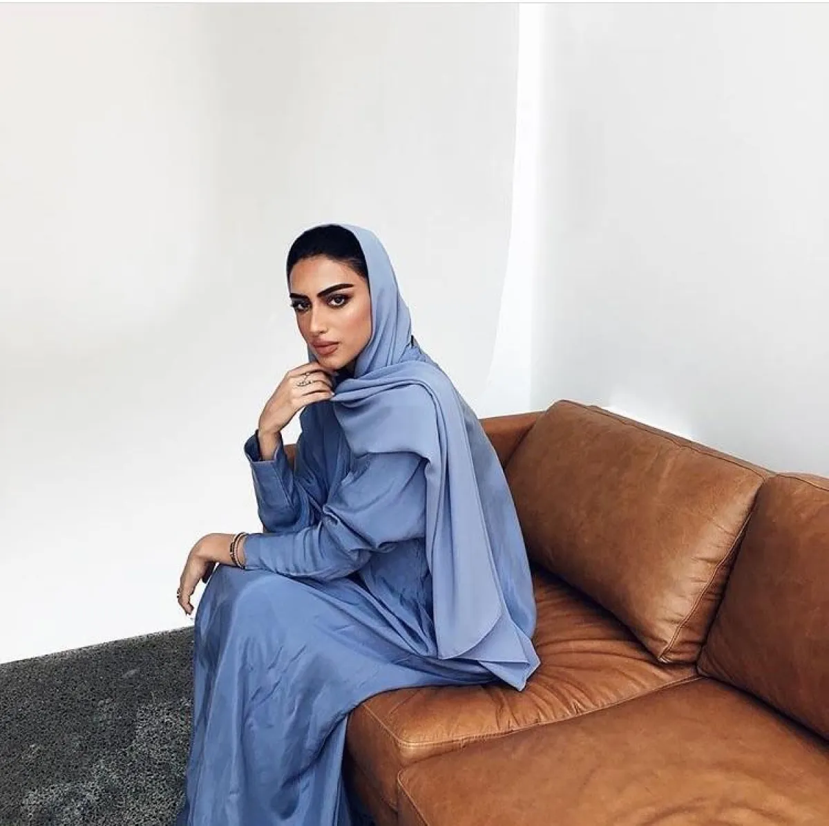 كذلك اعتمدت المدونة وخبيرة المكياج يارا النملة على العبايه بدرجة الأزرق السماوي، لكنها اختارت ستايل أكثر هدؤا وبساطة من خامة الستان المنسدلة، مناسبة وعملية لكل مشاويرك بالنهار، كما أن هذه الدرجة من اللون ستبدو ناعمة لبشرتنا الخمرية بعالمنا العربي.