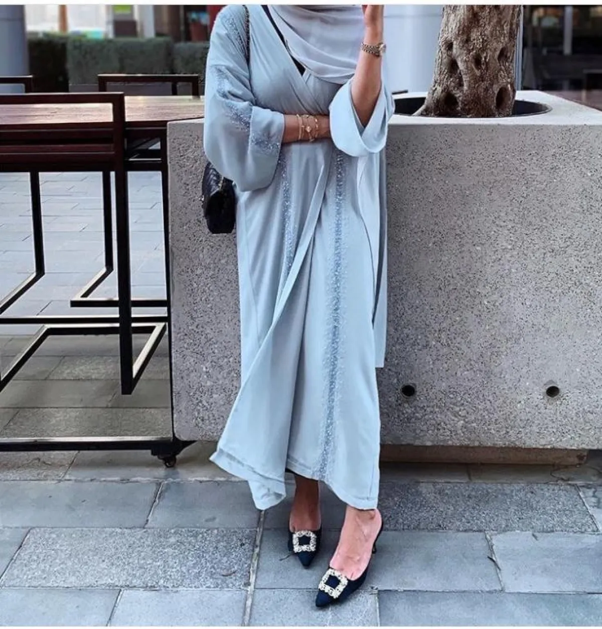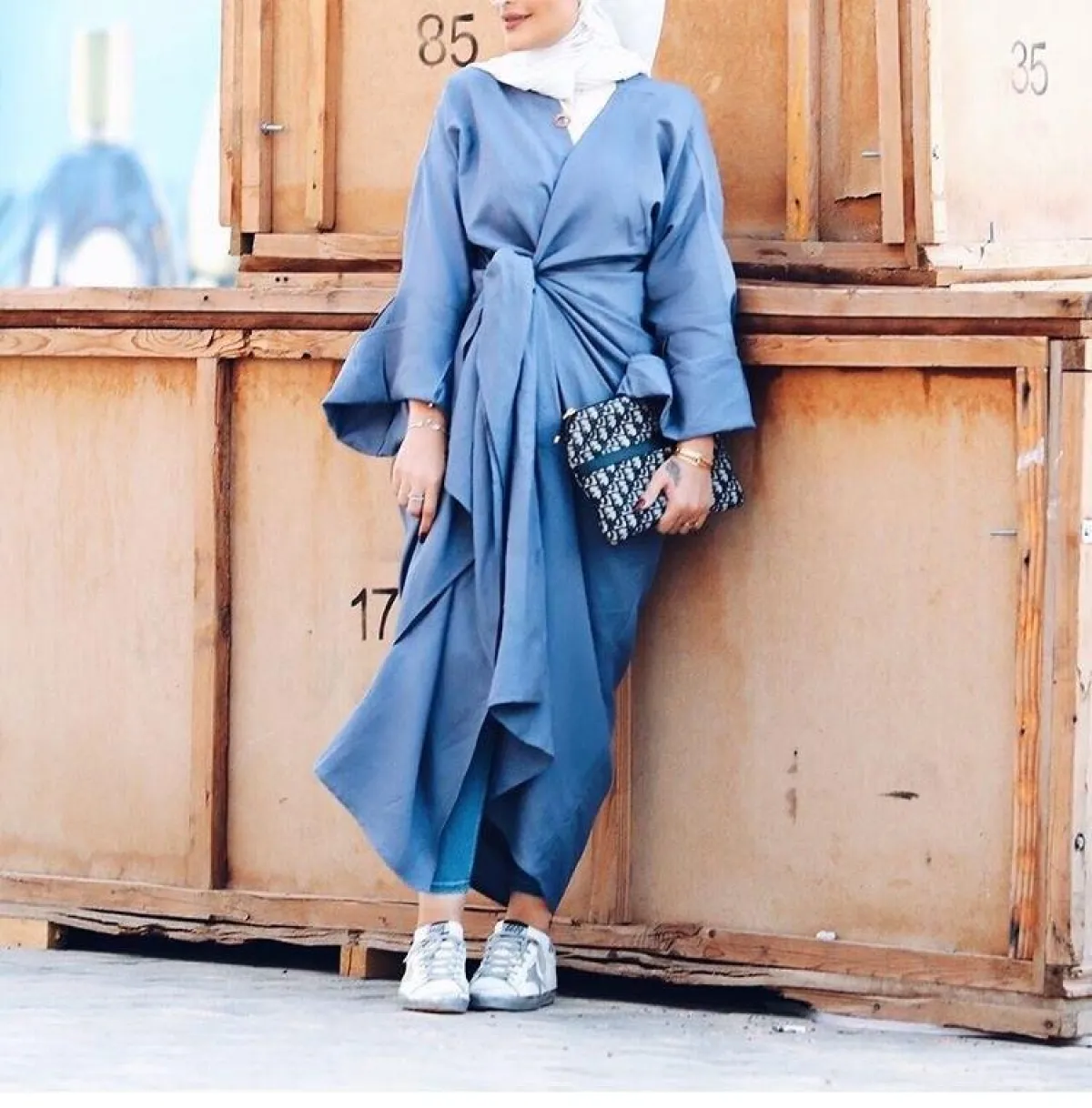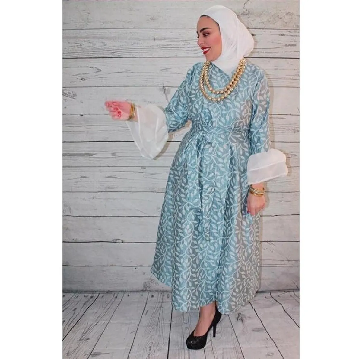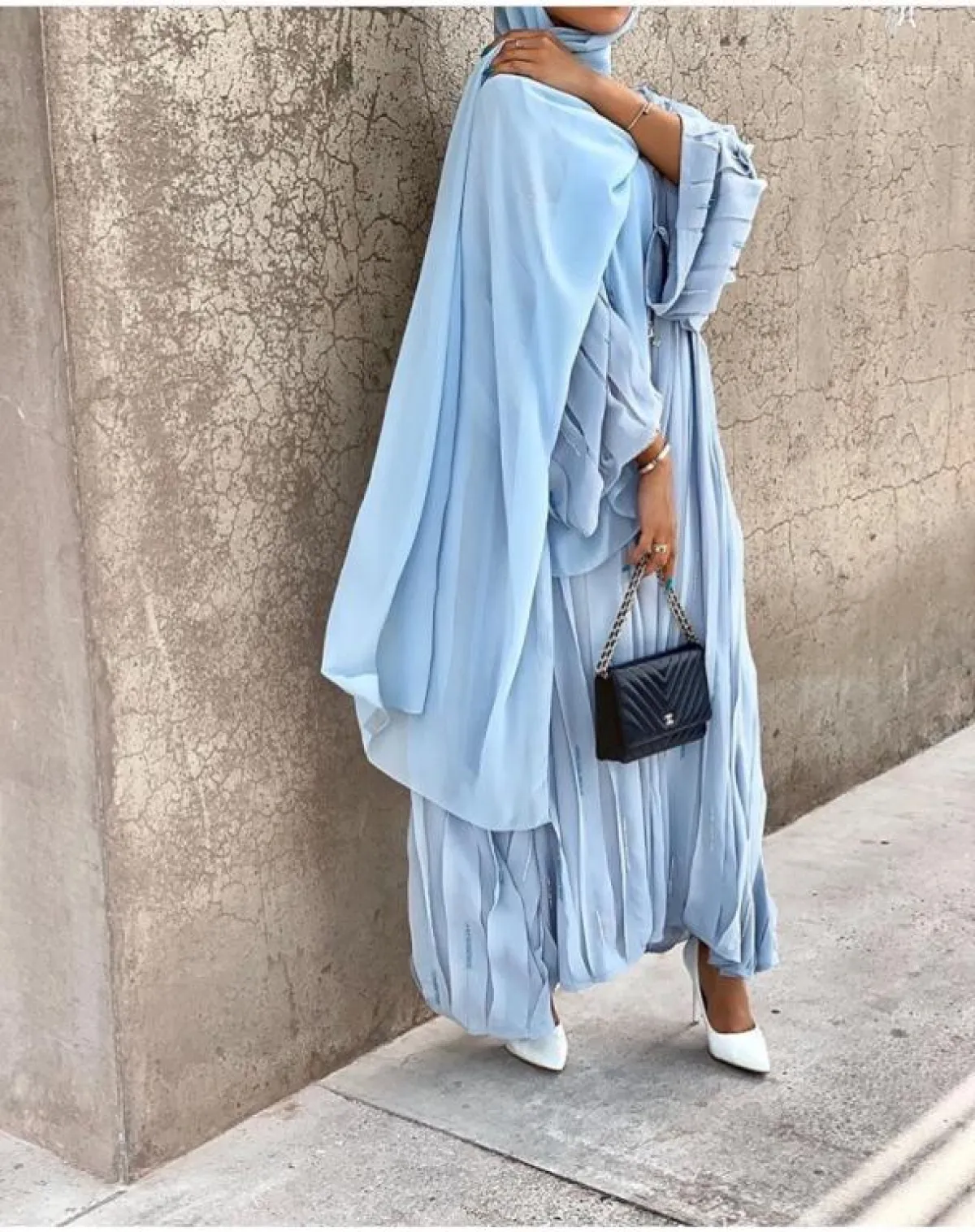 كذلك اعتمدت المدونة وخبيرة المكياج يارا النملة على العبايه بدرجة الأزرق السماوي، لكنها اختارت ستايل أكثر هدؤا وبساطة من خامة الستان المنسدلة، مناسبة وعملية لكل مشاويرك بالنهار، كما أن هذه الدرجة من اللون ستبدو ناعمة لبشرتنا الخمرية بعالمنا العربي.