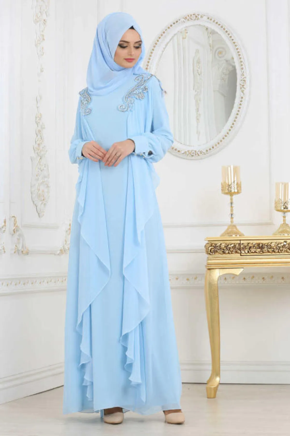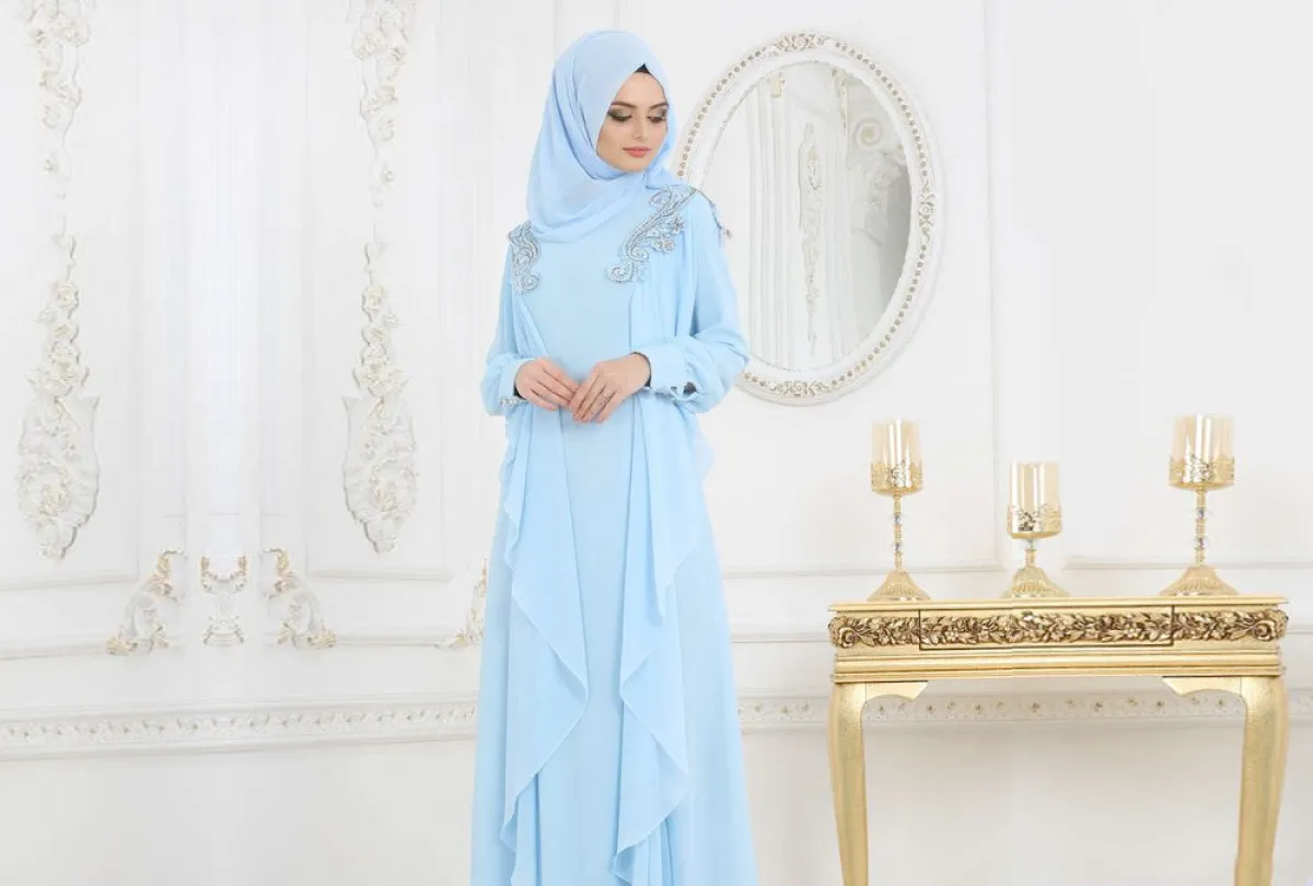 الفاشينيستا فاطيمة اختارت درجة الأزرق السماوي الفاتحة بأجدد إطلالتها، للعباية الفراشة مع الكشكش المنسدل، مع الكعب الأزرق وطرحة بيضاء، لتبدو أكثر كلاسيكية وتتماشى مع ستايل العباية، مع اللمسة المخملية.