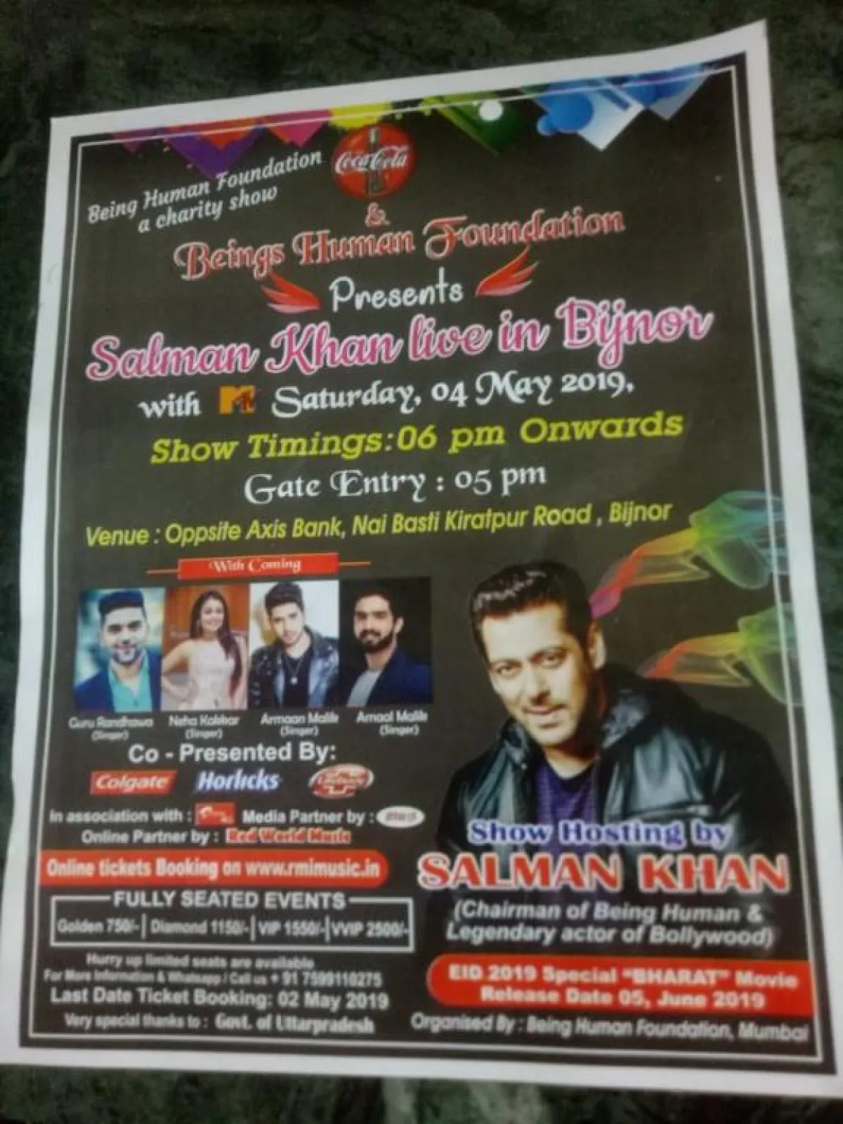 غرّد نجم بوليوود Salman Khan سلمان خان صباح اليوم 4 أيار/مايو 2019 على حسابه الخاص في تويتر نافياً استضافته في حفل خيري في منطقة Bijnor، مصرحاً أن مؤسسته الخيرية Human Being لن تقدم المعرض المقرر بدؤه اليوم 4 مايو.