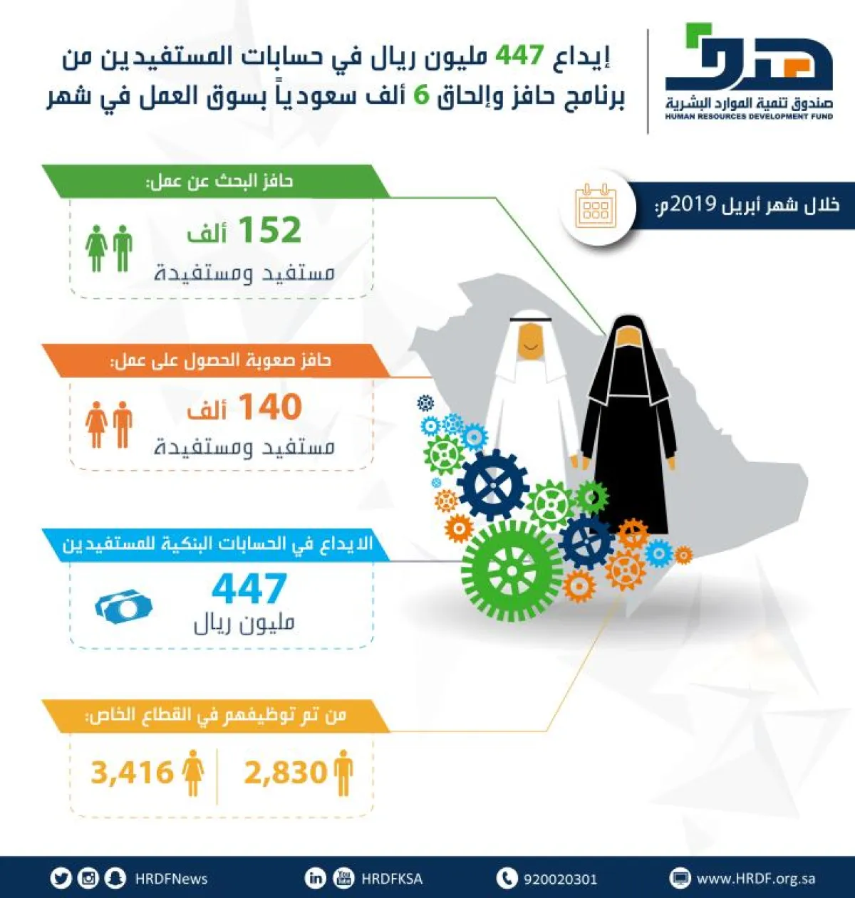 أودع صندوق تنمية الموارد البشرية (هدف)، أمس(الأحد)، أكثر من 447 مليون ريال، في الحسابات البنكية لأكثر من 292 ألف مستفيد ومستفيدة من المسجلين في برنامجي حافز البحث عن عمل وحافز صعوبة الحصول على عمل، وذلك عن شهر أبريل 2019م.