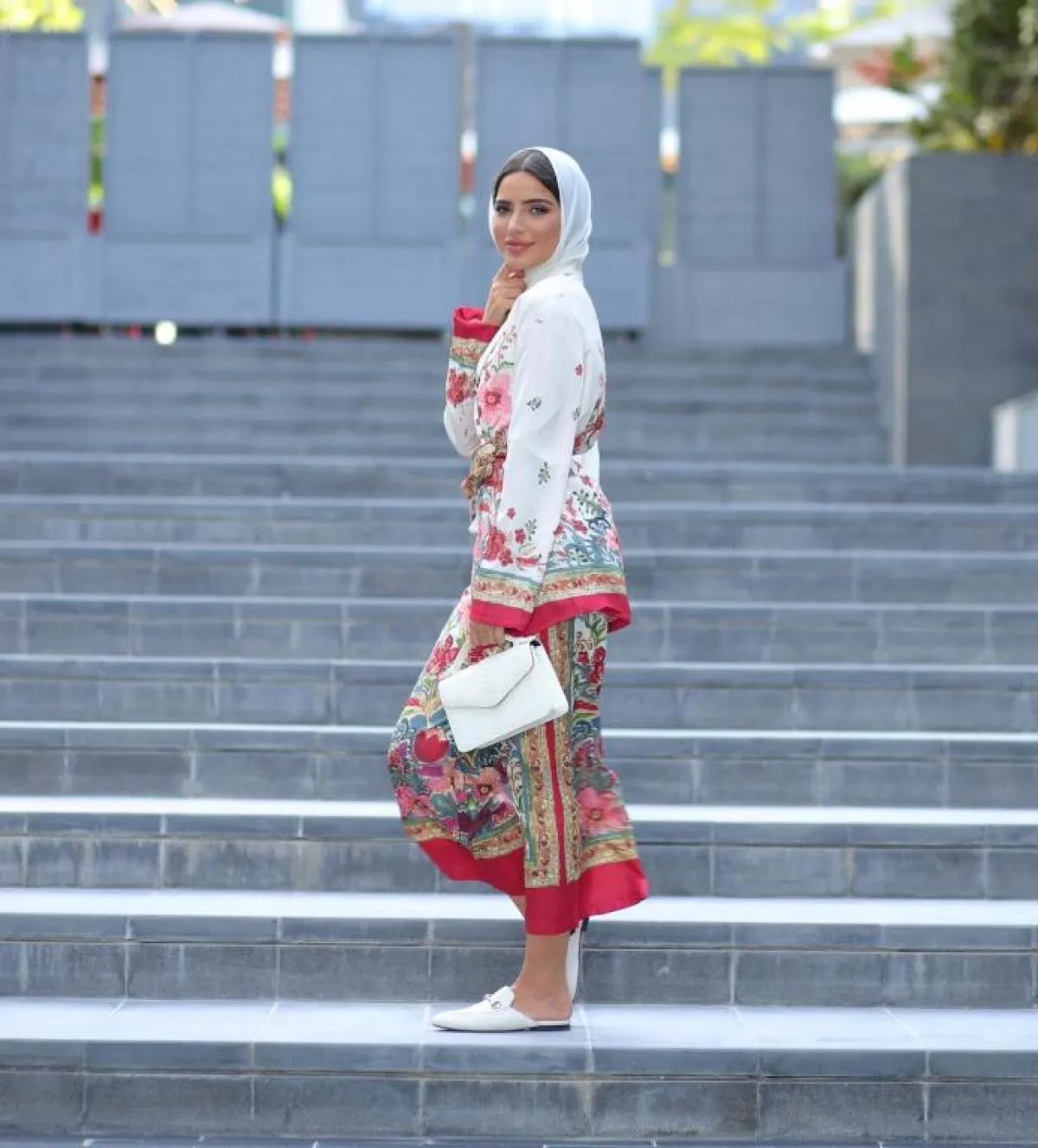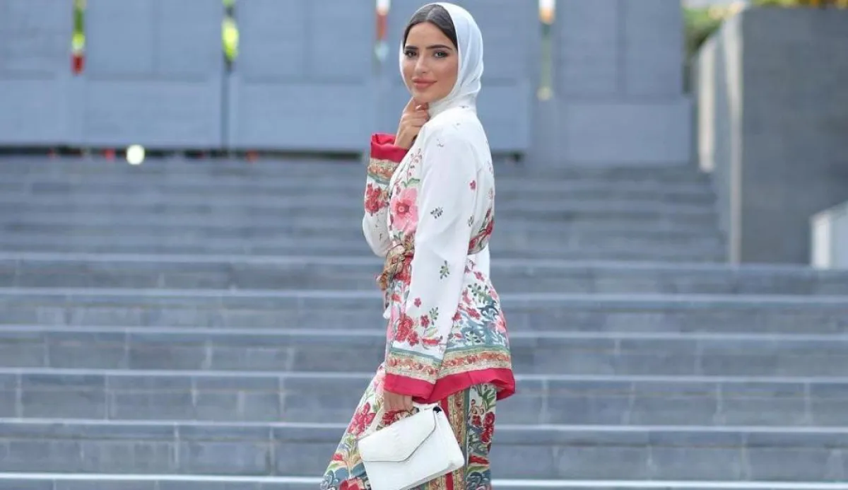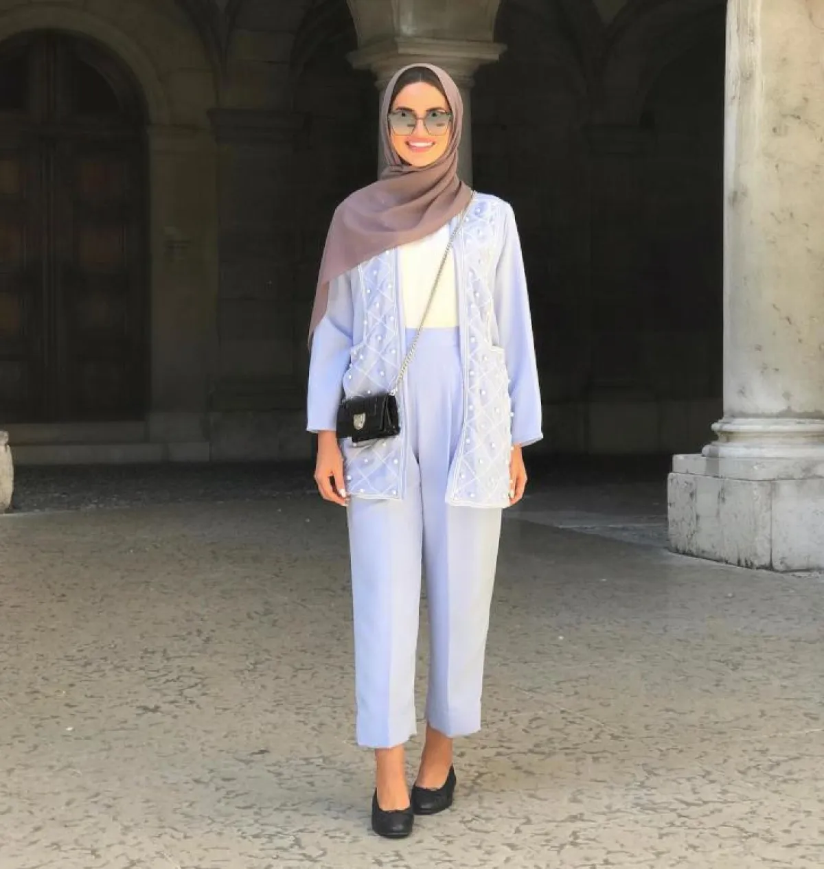 كذلك، اختارت المدونة المحجبة فاطمة حسام، بدلة باستيل مزدانة بحبات اللؤلؤ، ما تعدّ اطلالة مسائية أنيقة، بخاصة وأنها نست معها حجابًا أبيض أضاف إليها نعومة.