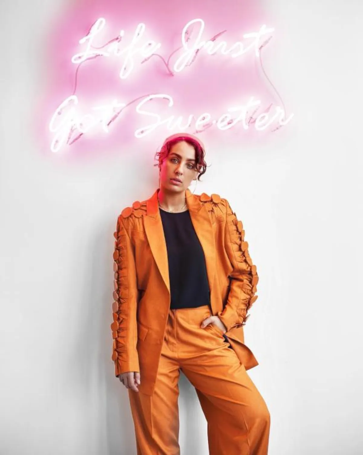 إذا كنتِ تفضلين اعتماد البدلة بأسلوب عصري، يمكنكِ محاكاة اطلالة آسيا التي اعتمدت على التي شيرت والحذاء الرياضي، لتحدّ من الطابع الرسمي للبدلة.