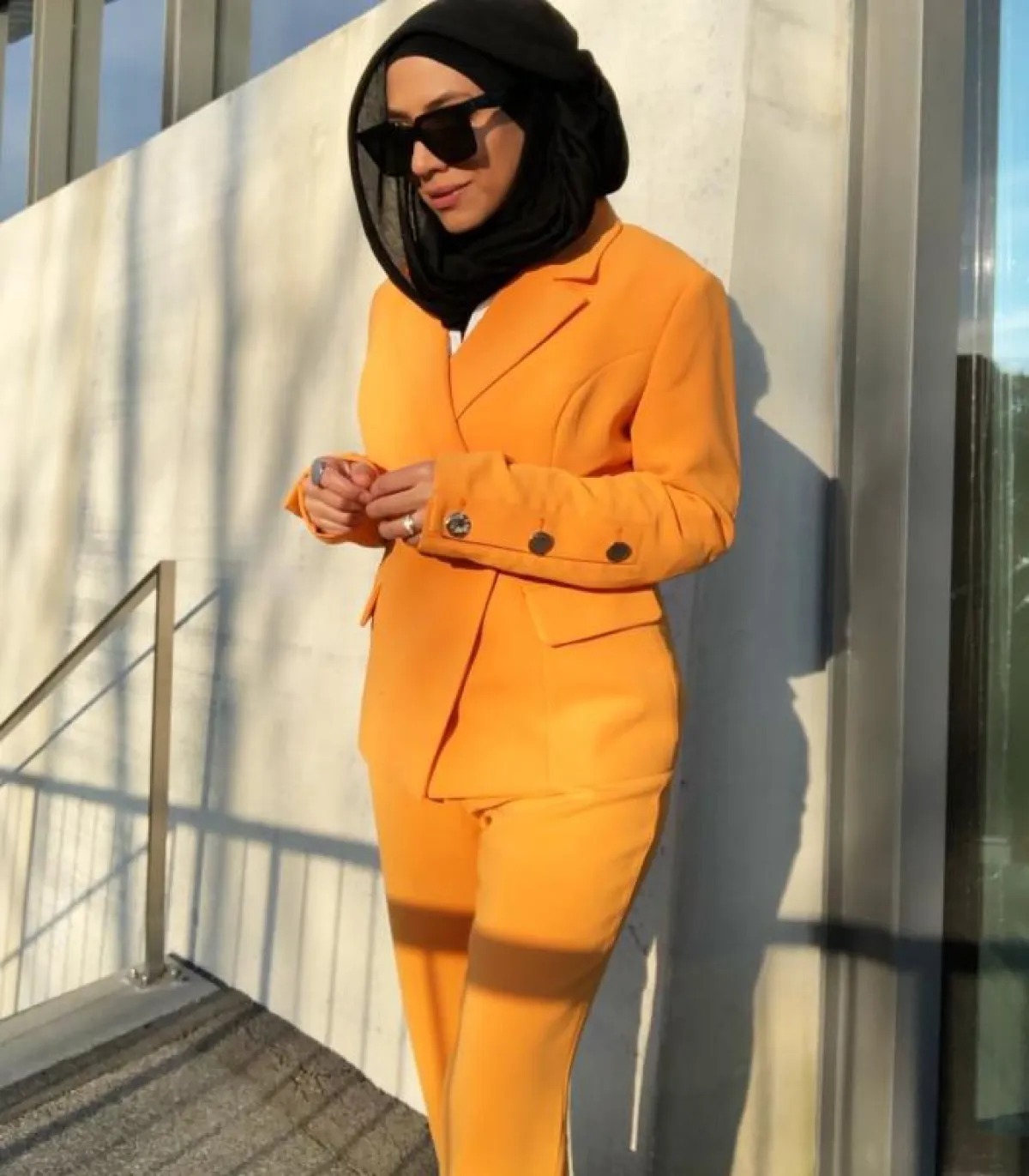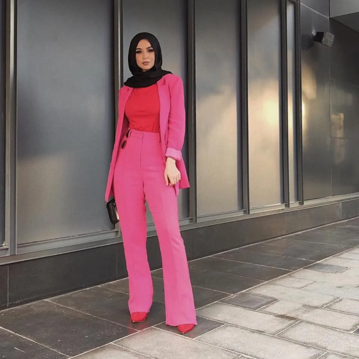 إذا كان البعض ينظر للأصفر باعتباره لونًا جريئًا بالنسبة للمحجبات، فنظن أنّ الأجرأ كانت المدونة المحجبة سهى، التي اعتمدت بدلة رسمية باللون الفوشيا الساطع، ونسقته مع حذاء وتوب أحمر، صحيح أنه مزيج مفعم بالأناقة والأنوثة، لكنه بلا شك اختيار جريء حدت منه سهى بحجاب أسود.