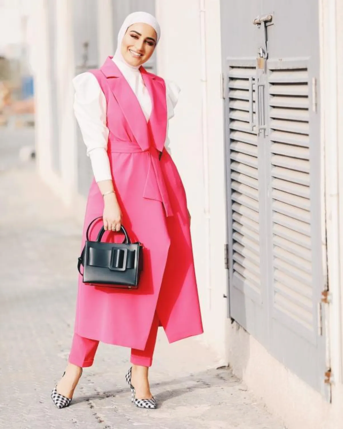 إذا كانت البدلة الرسمية بشكلها التقليدي لا تروق لكِ، يمكنكِ الاستعاضة عنها ببدلة من دون أكمام على طريقة المدونة دلال الدوب، التي اعتمدت بدلة فوشيا بحزام ضمّ الخصر، ونسقت معها قميصًا أبيض بأكمام منفوخة.