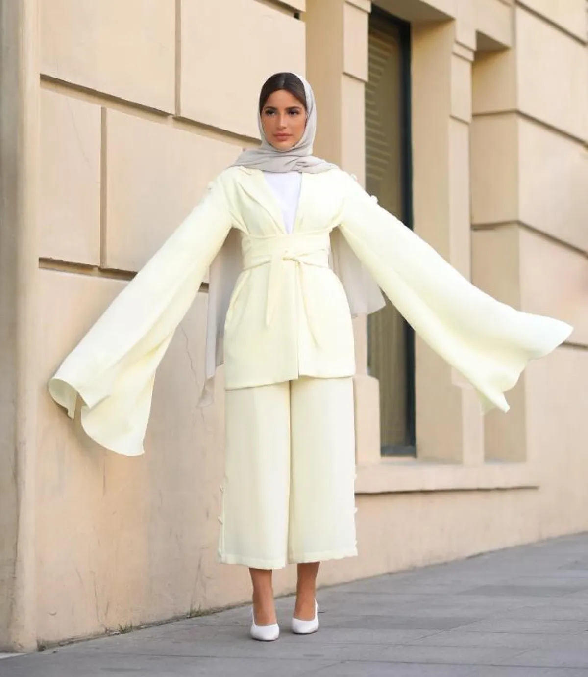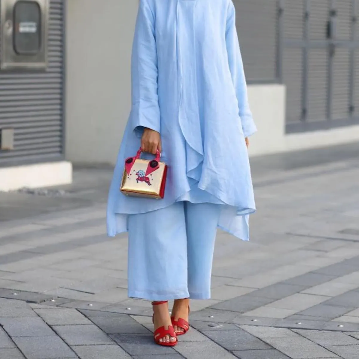 تميل فاطمة حسام إلى درجات الباستيل الناعمة، بدأت الربيع باطلالة باللون السماوي من الرأس إلى القدم، واختارت أن تنسق تونيك امتد إلى الركبة، مع بنطلون واسع وصل إلى الكاحل، ونجحت هذه الاطلالة في استحضار روح الربيع، ليس فقط بفضل لونها المستمد من الطبيعة، بينما بفضل القماش الكتان المناسب للطقس الحار.