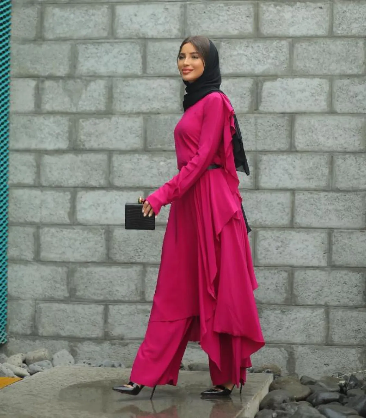 وعلى عكس درجات الباستيل الناعمة، فقد ذهبت المدونة فاطمة حسام إلى تطبيق صيحة المونوكروم بلون قوي وصارخ، حيث اعتمدت اطلالة باللون الفوشيا الرائج هذا الموسم، ولكن هذه المرة كسرت القاعدة واختارت حجابًا أسود.