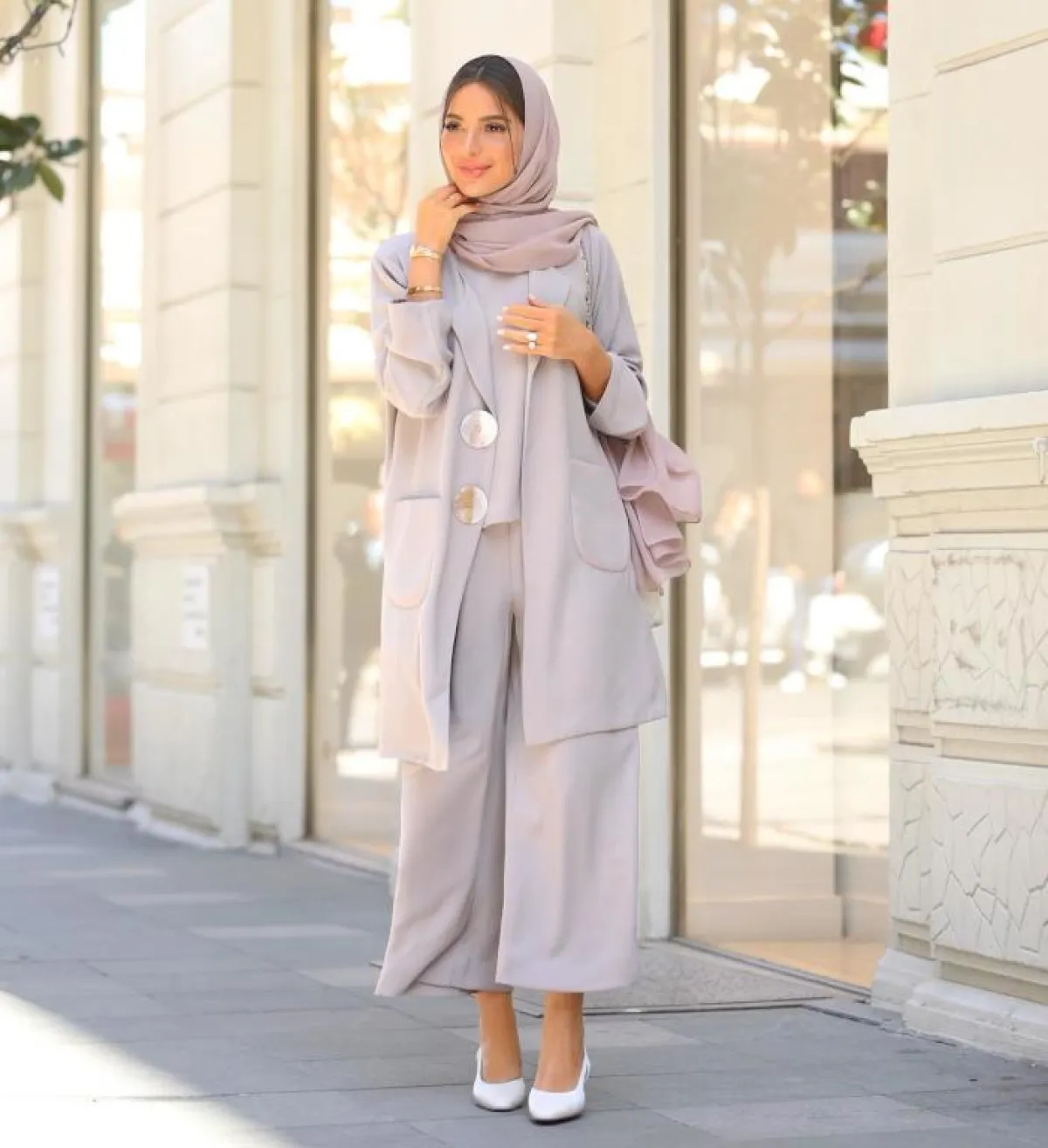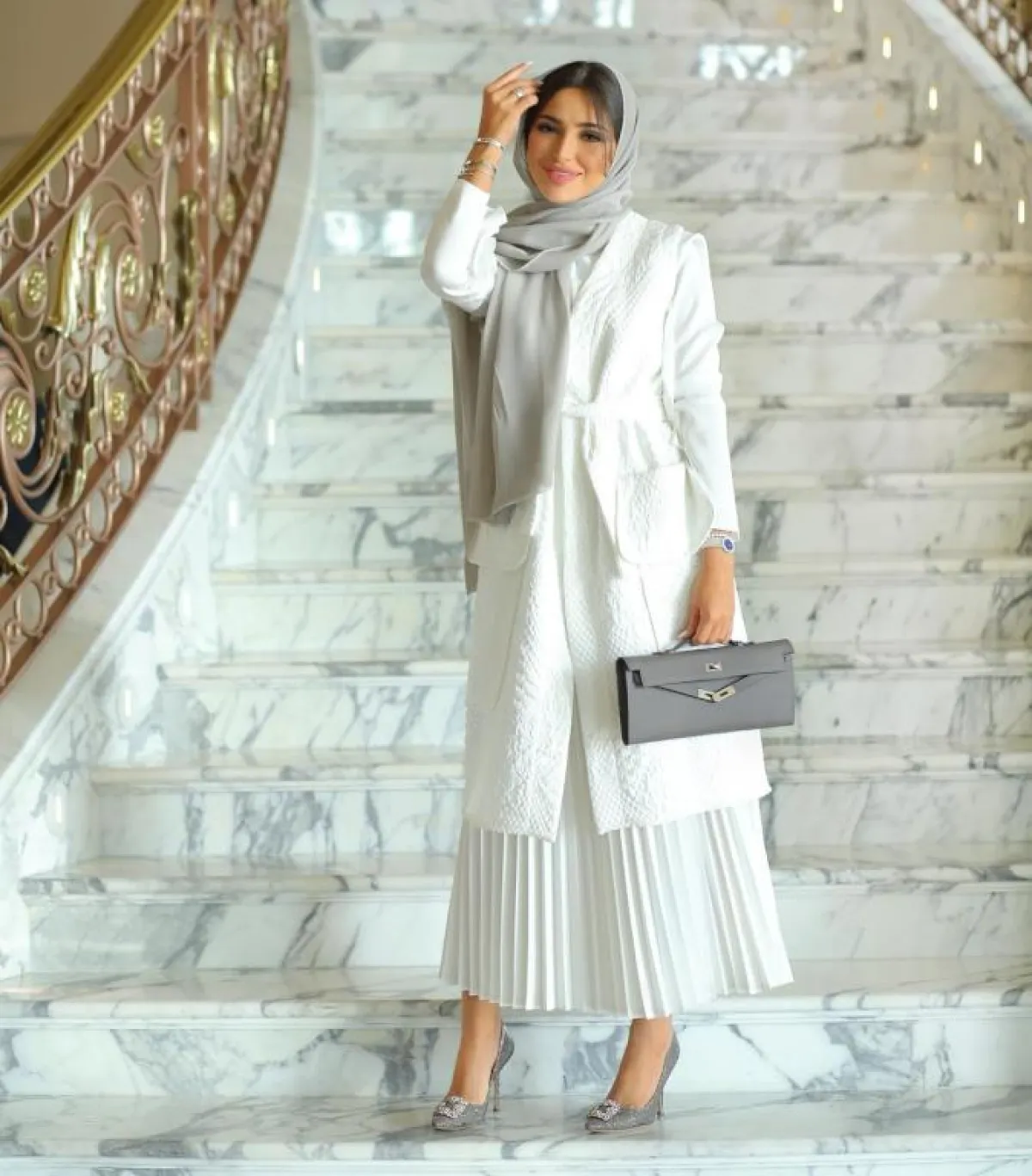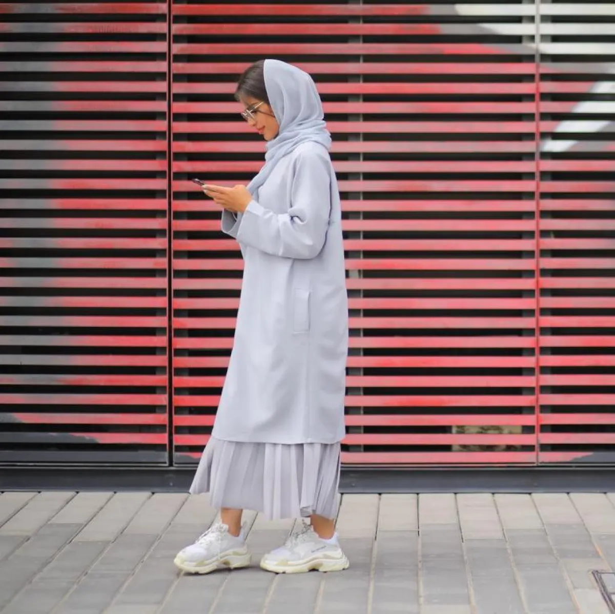 ذهبت أيضًا إلى اطلالة رمادية فاتحة، حيث نسقت معطفًا خفيفًا مع تنورة مكسرة ماكسي، وأضافت لمسة عصرية بزوج من الأحذية الرياضية، أما الحجاب، فاختارت أن يكون باللون نفسه.