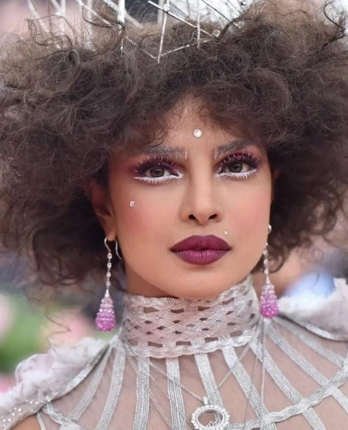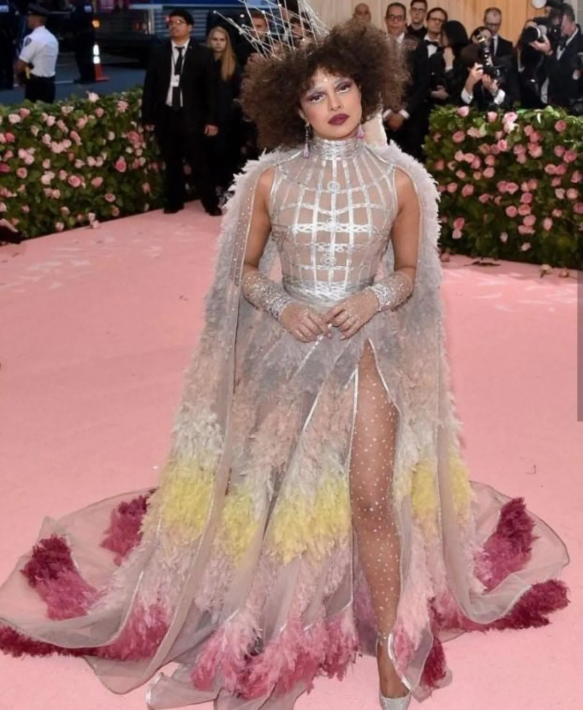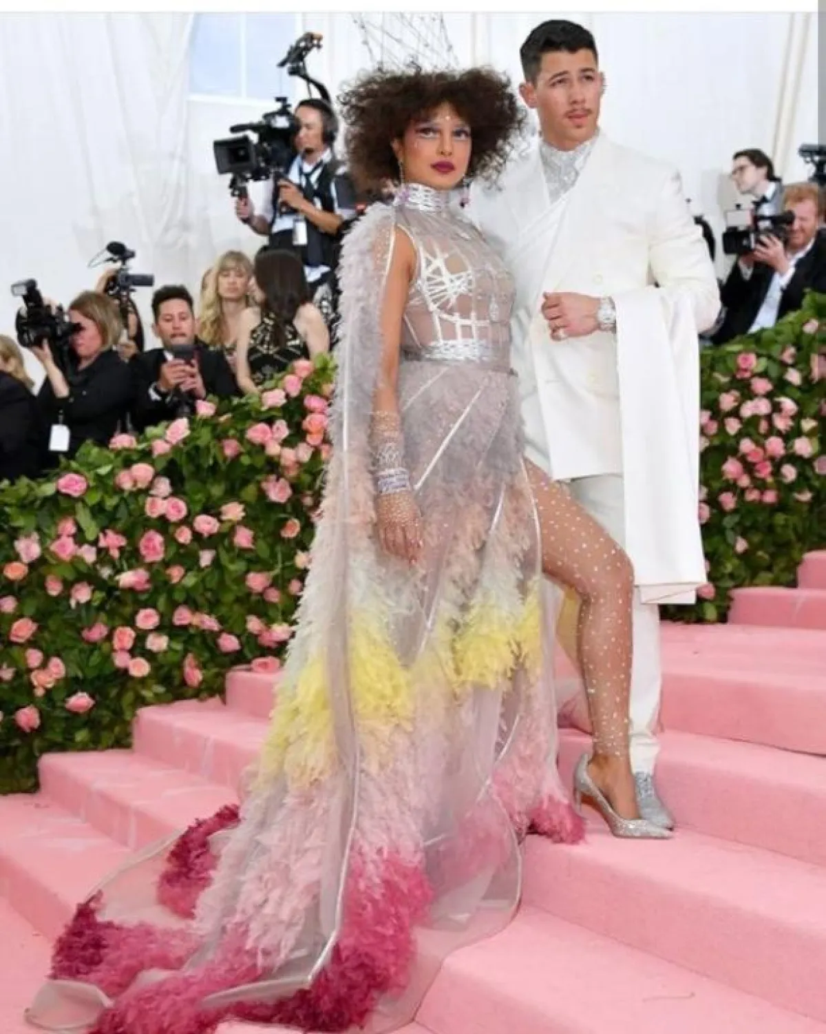 بريانكا تألقت على السجادة الوردية باطلالة أثارت الجدل، حملت توقيع دار ديور Dior العالمي، أضافت عليها التاج الماسي والمجوهرات الفخمة من شوبارد Chopard، حيث مشى بجانبها زوجها نيك مرتديًا بدلته البيضاء.