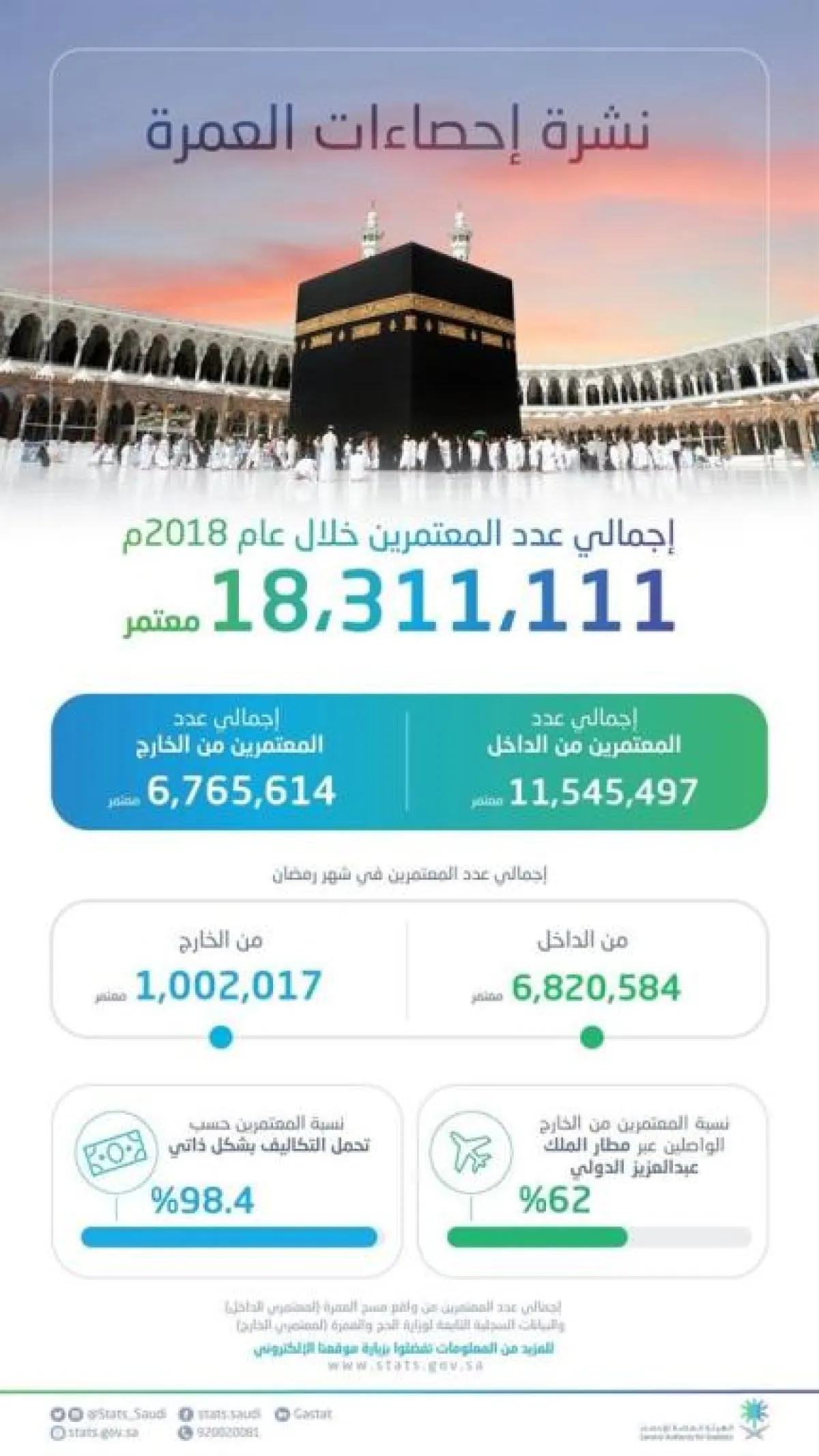 كشف تقرير صادر من الهيئة العامة للإحصاء، أن إجمالي المعتمرين الذين أدوا العمرة خلال العام الماضي 2018 بلغ (18311111) معتمراَ.