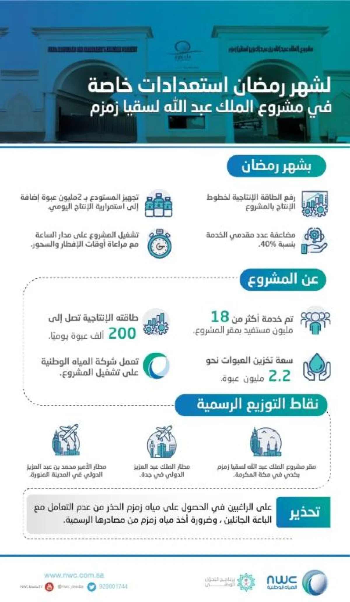 أكدت شركة المياه الوطنية المشغل الرئيسي لمشروع الملك عبد الله بن عبد العزيز لسقيا زمزم جاهزيتها لمواكبة الطلب المتزايد على مياه زمزم في شهر رمضان المبارك للعام 1440هـ، وذلك من خلال الاستعدادات المبكرة، ورفع الطاقة الإنتاجية لخطوط الإنتاج بالمشروع لتتواكب مع الزيادة المتوقعة في الطلب في ظل المشاريع العملاقة والتوسعات التي يحظى بها المسجد الحرام والمسجد النبوي الشريف، كما تم تجهيز المستودع بـ (2,000,000) عبوة، إضافة إلى استمرارية الإنتاج اليومي، حيث قدم المشروع في مقره الرئيسي بكدي خدماته لأكثر من (18) مليون مستفيد منذ انشائه.