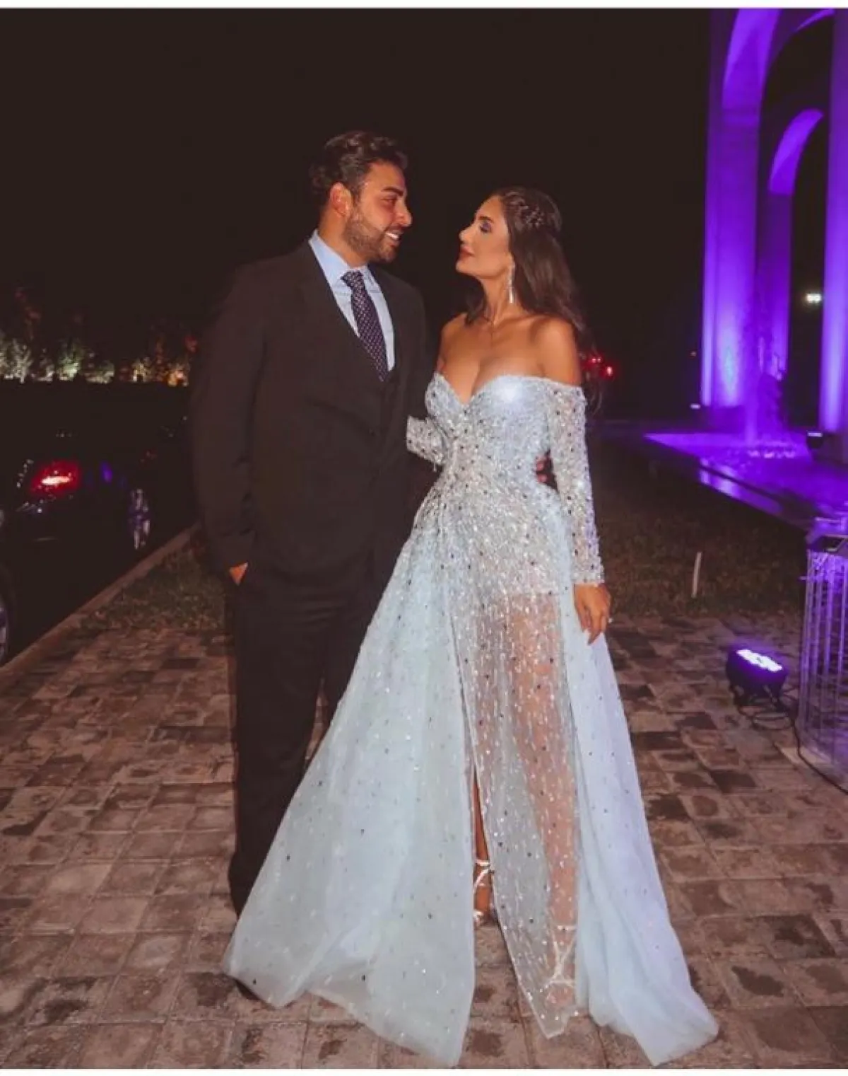 الفستان الساتان المخملي الأزرق، سيناسب الصبايا صاحبات الخصر الصغير مثل الفاشينيتسا دانا الطويرش، سيمنحكِ اطلالة جاذبة للأنظار، بسيط وراقٍ، ولونه دارج ولافت بشكل كبير يليق بكِ كعروس.