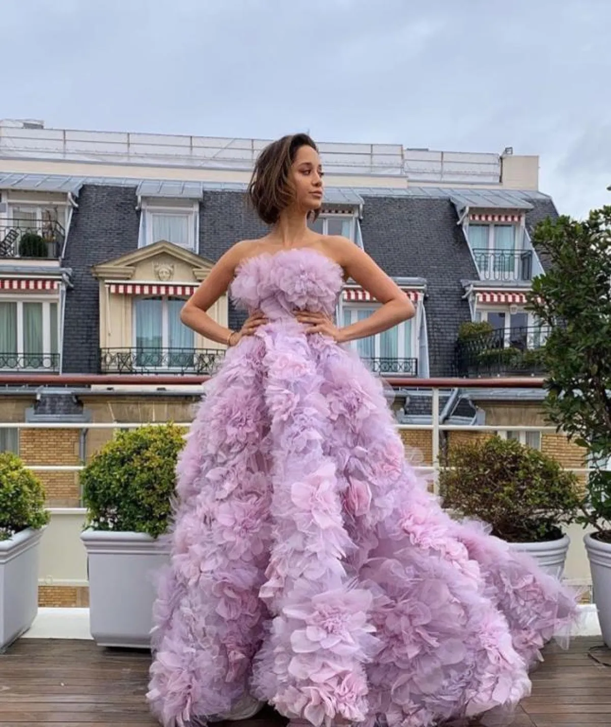 الفستان المنفوش مع الكشكش، سيكون خيارًا مميزًا إن كنتِ تحبين أجواء السندريلا، وبالوقت نفسه تبحثين عن فستان يمنحكِ لوك به لمسة من المرح، كما أنّ درجة السومون مناسبة بشكل كبير لصاحبات البشرة الخمرية، والبيضاء كذلك.