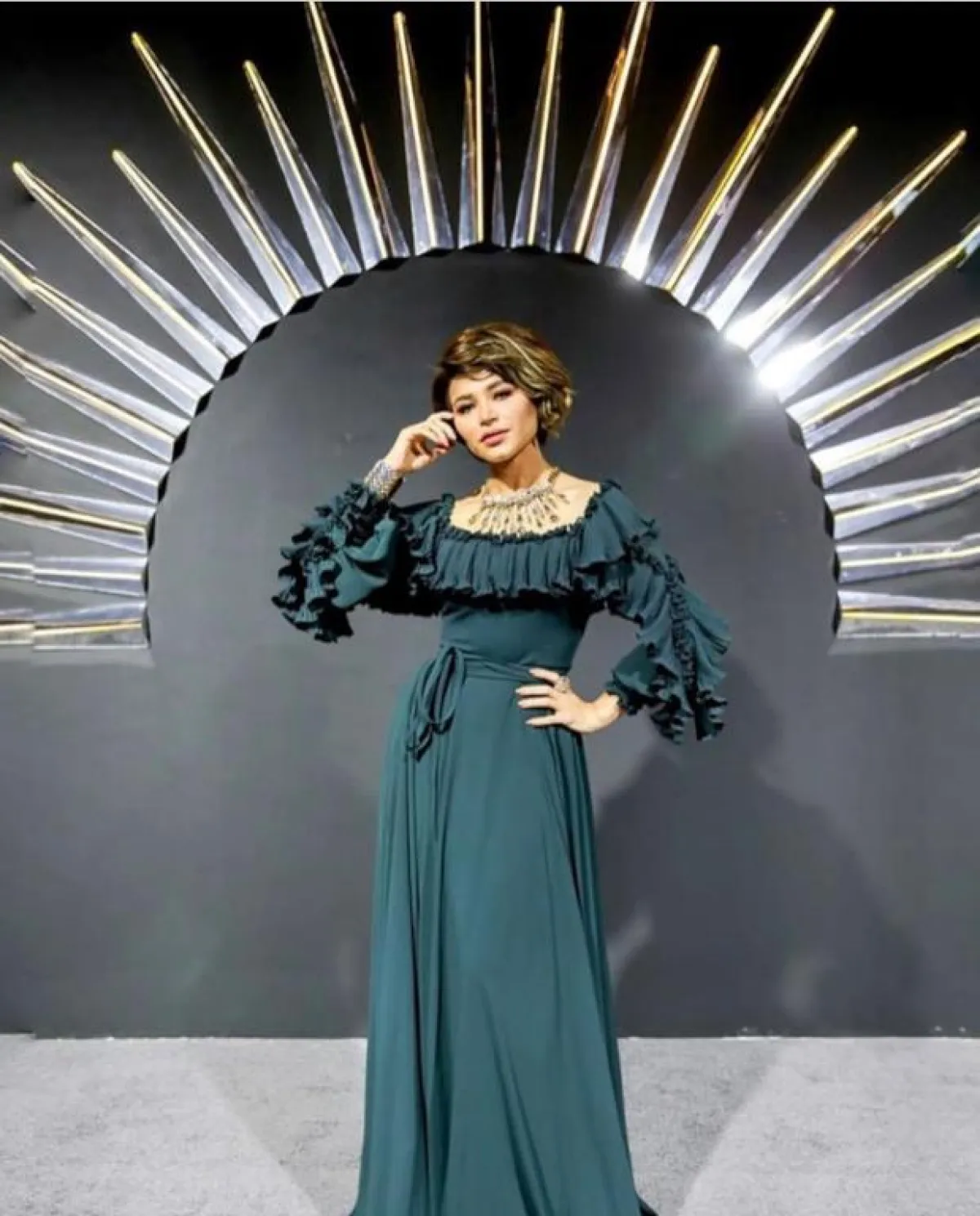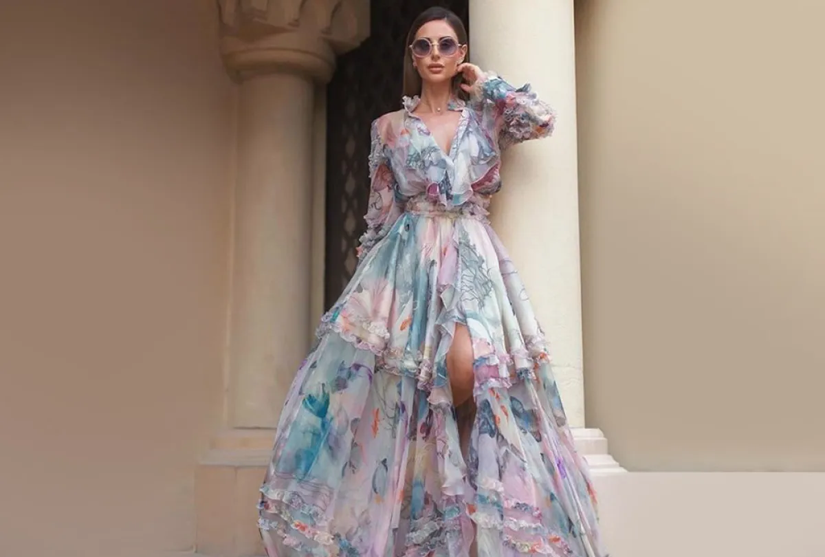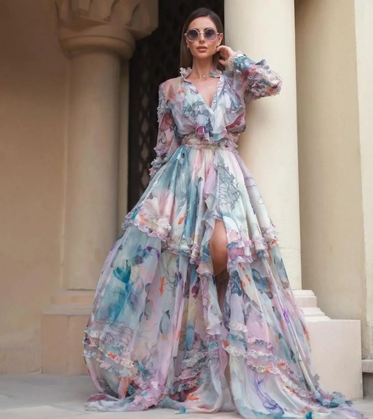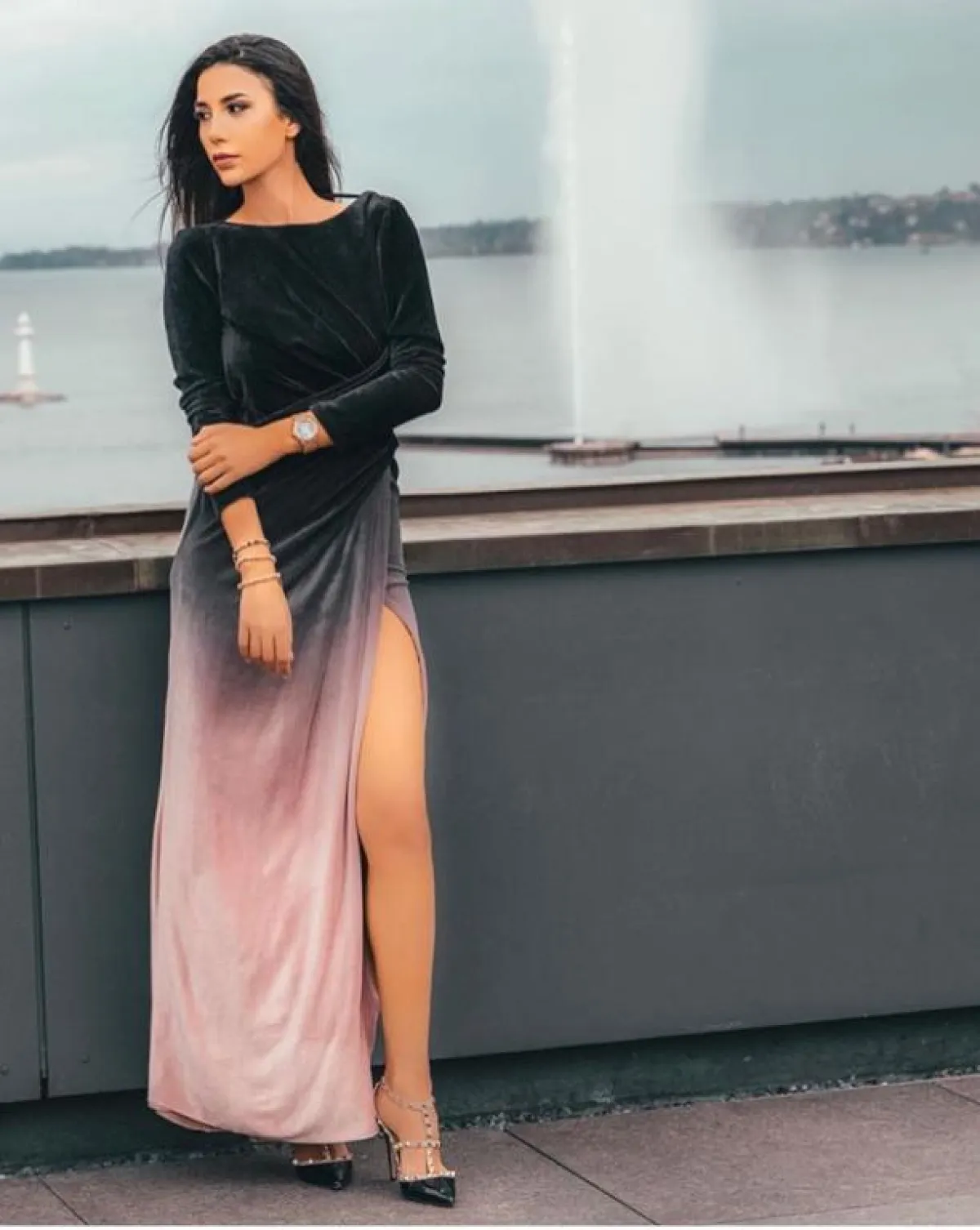 أما إن كنتِ تحبين الفساتين المنسدلة، فاختاري هذه الاطلالة من نادين عبد العزيز، مع فتحة الساق الجريئة، والمميزة للصبايا طويلات القامة، نسقيها مع حذاء مثير، لا سيما بكعب ذي رباط طويل يُبرز جمال ساقيكِ.