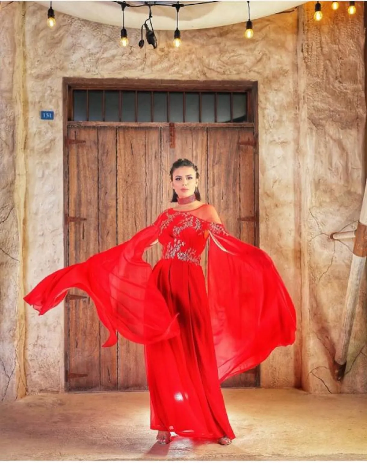 هذا الفستان الأحمر الناري من ديما الأسدي بلمسته الجريئة للأكمام المنفوشة، سيمنحكِ لوك مثيرًا يُبرز أنوثتكِ، مع التطريزات الفضية، اختاري معه تسريحة شعر مرفوعة واكسسوارًا فضيًّا، وحذاءً بلمسة من الميتالك تبهرين بها الحضور، وعريسكِ بالطبع.