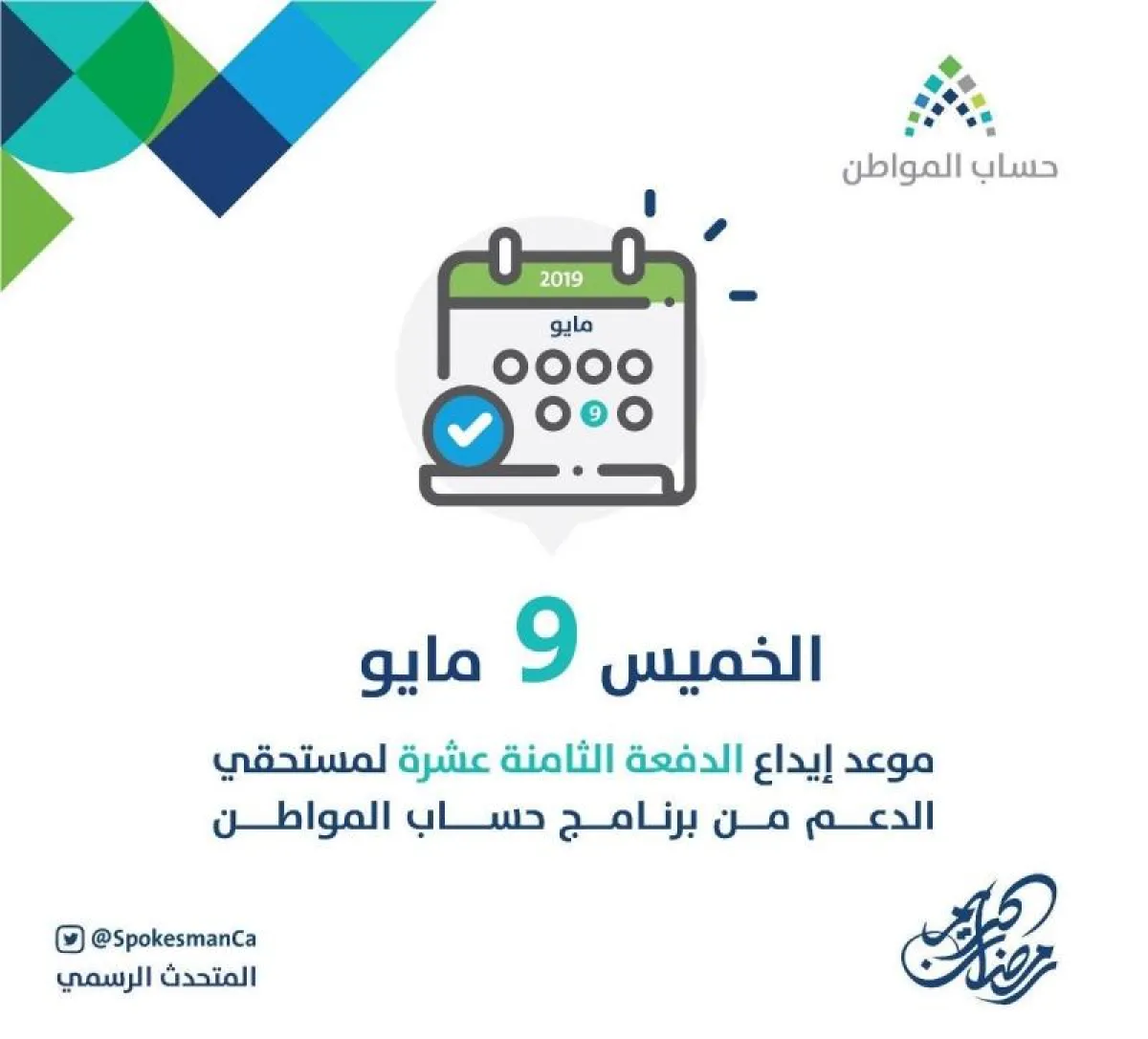 ذكر المتحدث الرسمي باسم برنامج حساب المواطن، سلطان القحطاني، في تغريدة عبر حسابه الرسمي في موقع "تويتر"، أنه: "سيتم صرف مخصص الدعم من برنامج #حساب_المواطن لمستفيدي الدفعة الثامنة عشرة يوم الخميس الموافق 9 مايو بإذن الله".