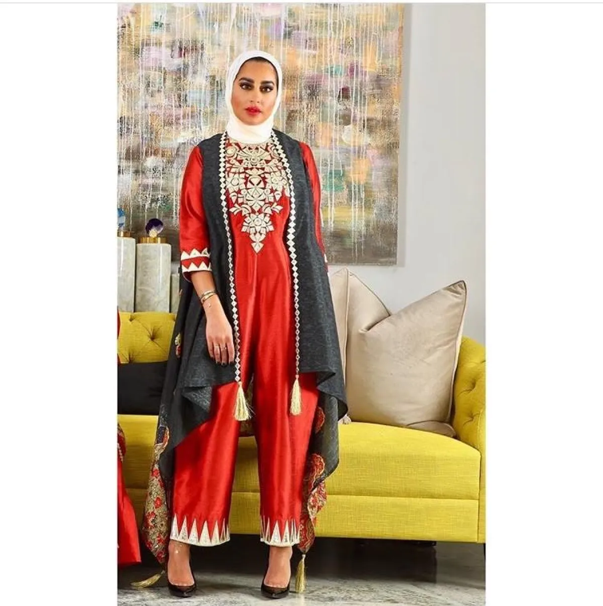 في المقابل اختارت دلال النقبندي جمبسوت أحمر ساتان، مع التطاريز البيضاء بالخيوط، مناسب لحفلات الإفطار والسحور، ويشعركِ أكثر بالأجواء الرمضانية، نسقت معه كارديغان من دون أكمام ليكون محتشمًا أكثر.