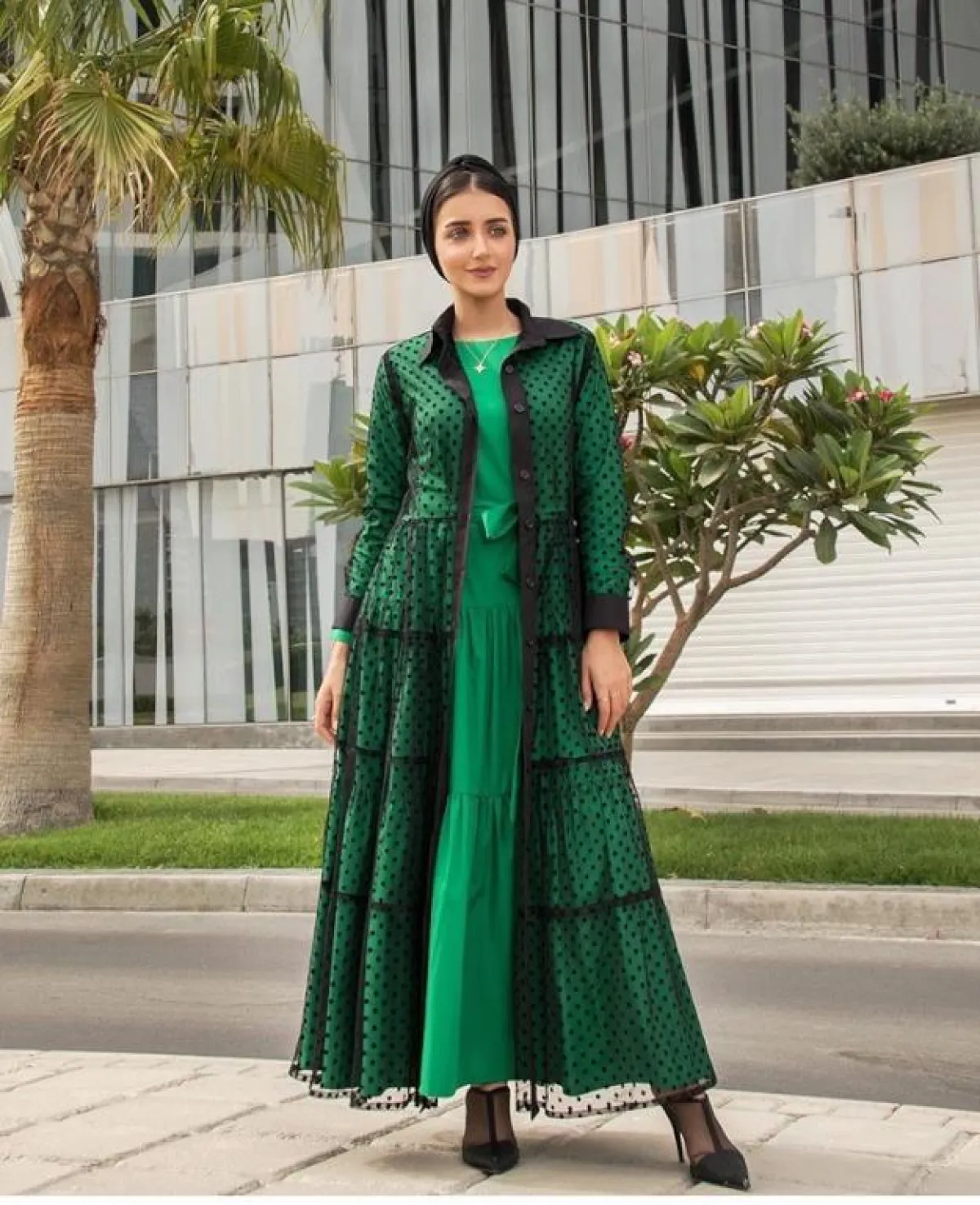 بينما اختارت خولة المراغي فستان عباية باللون الأخضر من الدانتيل المنقط، مع شوز مطرز من الدانتيل مدبب من الأمام، لإطلالة أنثوية من الدرجة الأولى، لكنها لا تحمل الكثير من الطابع الرمضاني.