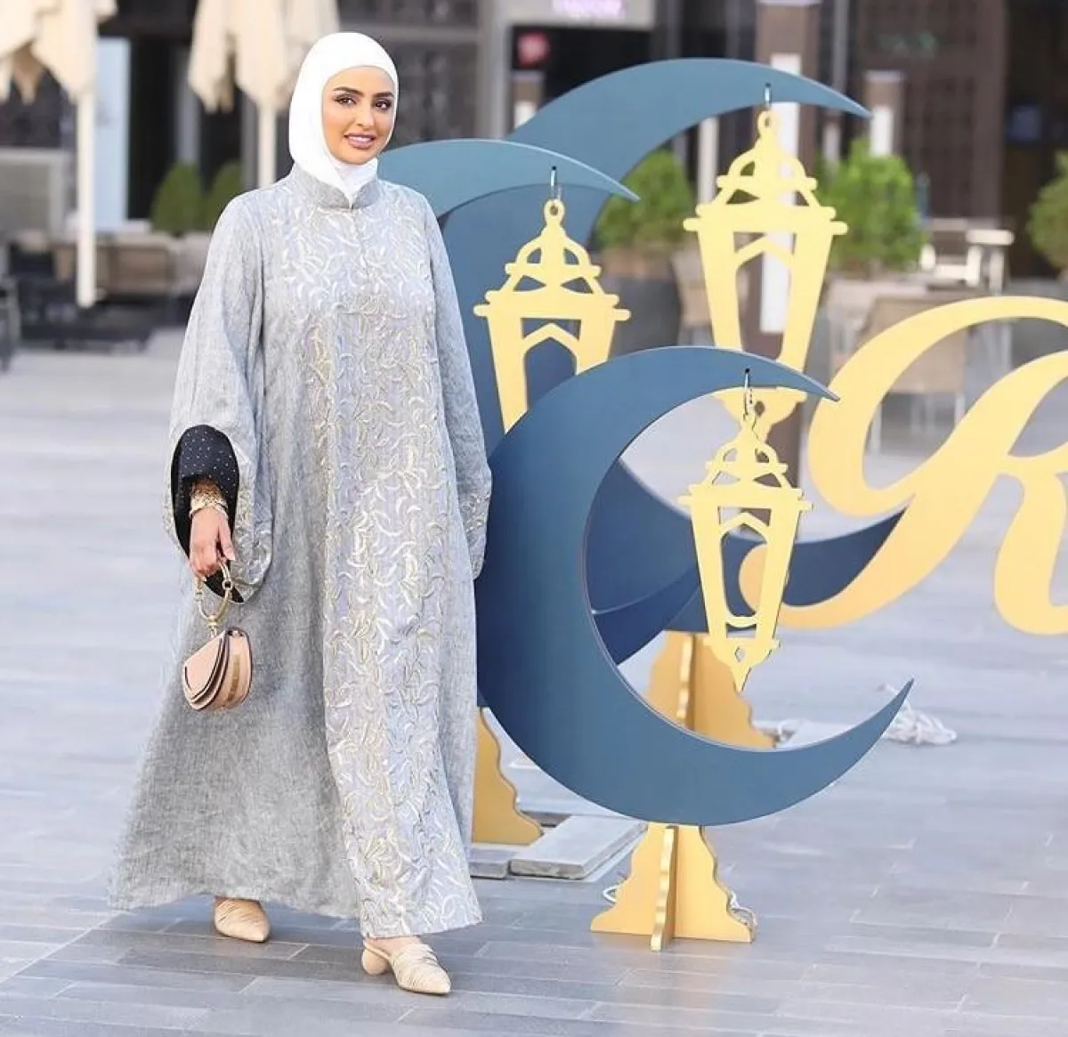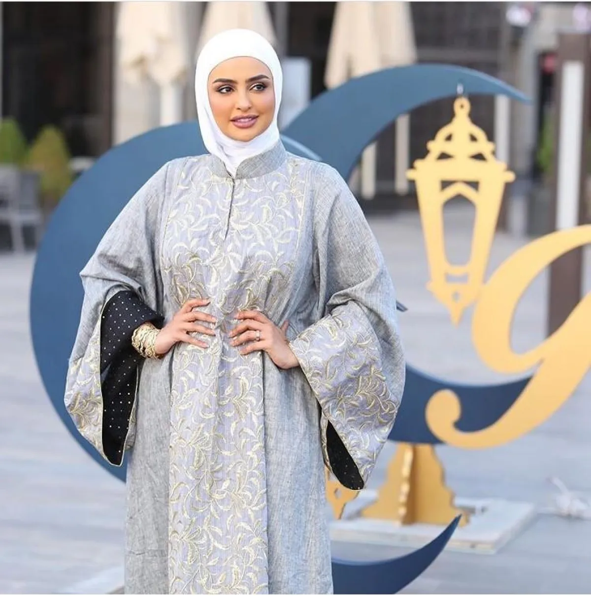 اختارت سندس قطان عباية من الكتان، مناسبة أكثر للصيف بدرجتها اللبني السماوي، مع شنطة صغيرة الحجم، وحذاء ميول مفتوح، لم يبدُ لونهما متناغمًا بشكل كبير.