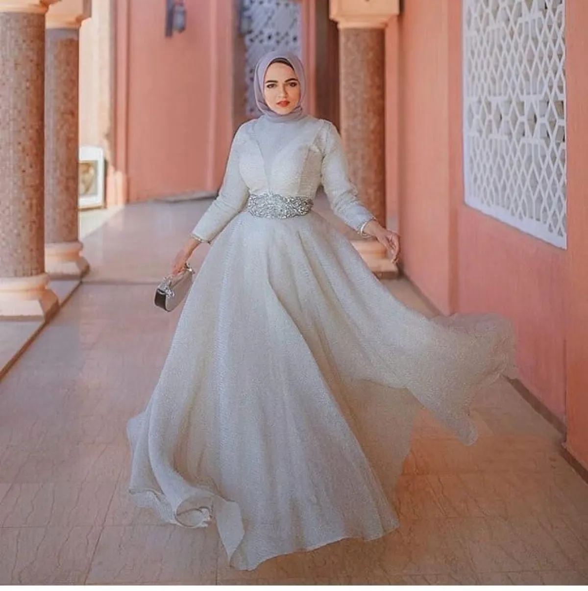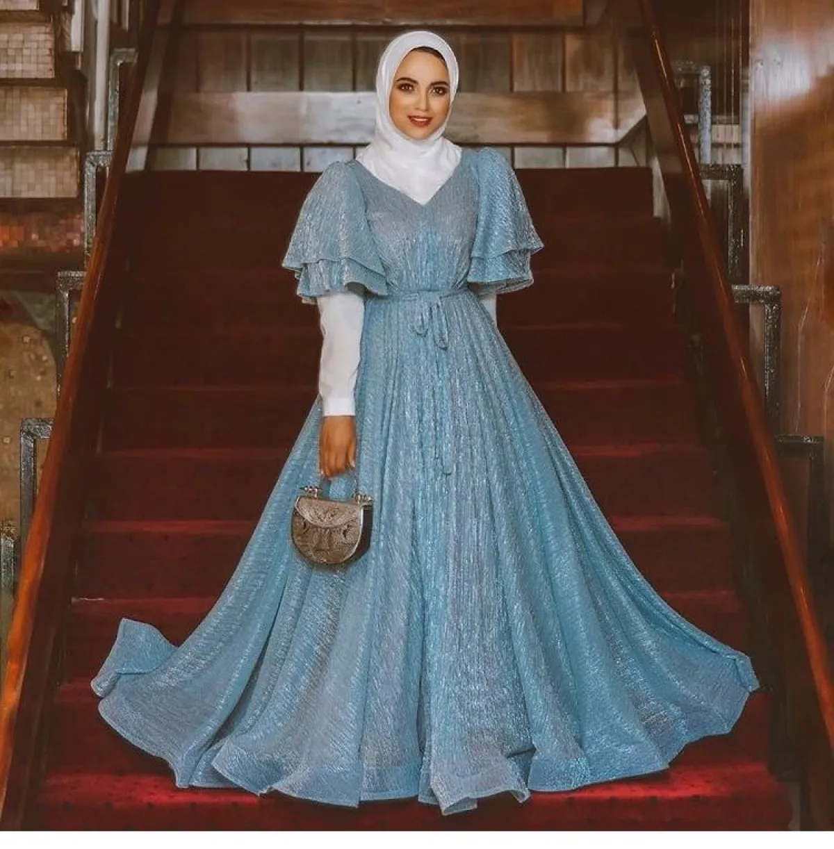 هذا الفستان من خامة الساتان الحريرية مناسب لـ حفلات السحور، بخاصة وإن كنتِ لا تحبين الكثير من التطريزات، مع الكشكش البسيط على الجزء السفلي من الفستان، نسقي معه حجاب أوف وايت، واجعليه يبدو منسدلًا على كتفيكِ، مع شوز بكعب عالٍ مدبب يمنحكِ طولًا ورشاقة.