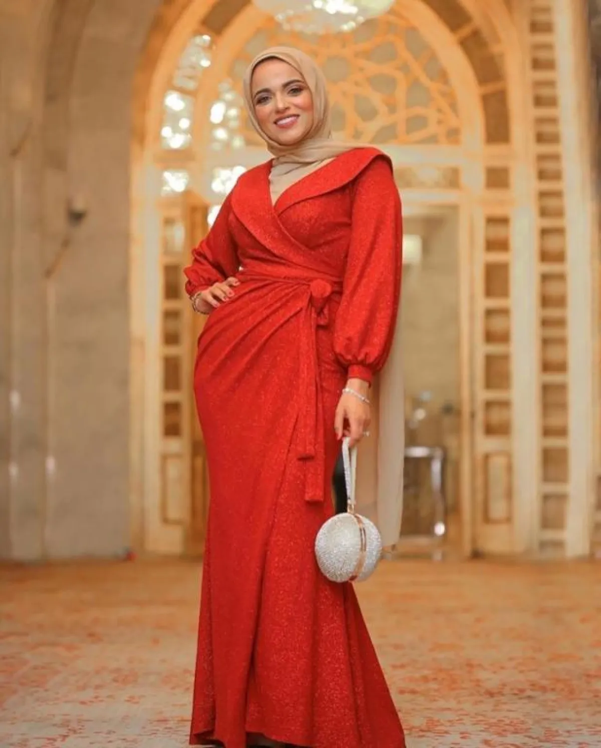 أما لمناسبات رمضان الليلية والحفلات الكبيرة، هذا الفستان باللون الأحمر سيكون لافتًا والوقت نفسه محتشمًا، بخاصة مع الطباعة المزركشة البسيطة التي تزين الفستان، من الممكن أن تزيّني معها كلتش به بعض الكلمات بالخط العربي مثلًا ليناسب الفستان، وحذاءً بكعب عالٍ.