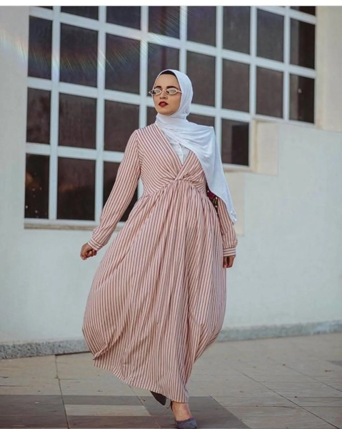 الفساتين المخططة من الصيحات التي مازالت مستمرة معنا لهذا الصيف، كالذي اختارته سهر فؤاد بخامات القطن الخفيفة، مع تصميم الـ Warp الذي يجعلكِ تبدين أنحف، لكن إن كنتِ قصيرة ننصحكِ باعتماد أحذية الـ wedges.