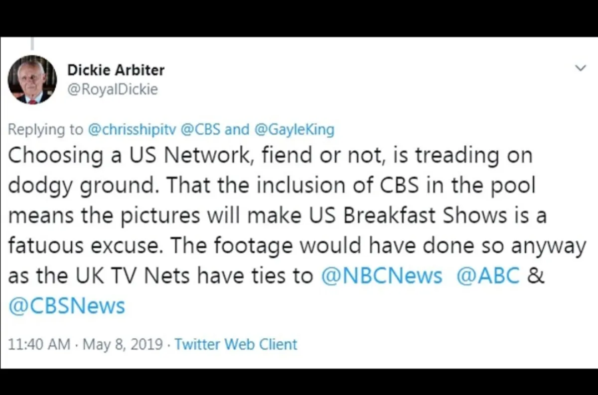 وصف السكرتير الصحفي السابق للملكة ديكي أربيتير قرار ميغان ماركل Meghan Markel والأمير هاري Prince Harry وطريقة إظهار ابنهما للعلن بالقرار"المراوغ والغاضب" معتبراً إياه استعراضاً خصوصاً وأن طريقة العرض أظهرت تحيّز ميغان لصديقتها الصحفية غايل كينج في شبكة التلفزيون الأمريكية CBS ومنحتها امتيازاً خاصاً.